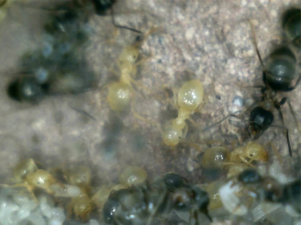 2014-03-29 - Altre nascite, alcune operaiette hanno l'addome molto grosso, vuol dire che vengono nutrite... Comunque tendono a raggrupparsi e ad accudire alle larve