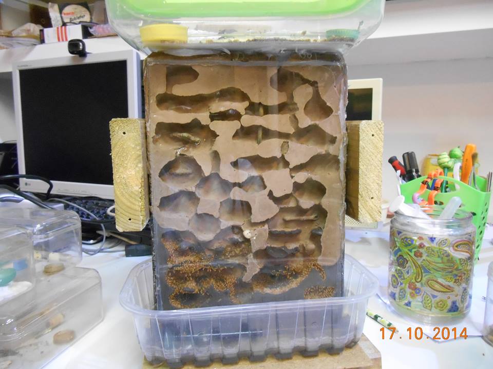 2014-10-17 - Finalmente il trasferimento è complicato.. ci sono stati vari problemi.. Ho dovuto agganciare la vecchia arena a un tubetto orizzontale. Le formiche sono tutte raggruppate in basso ora. Ma non escono in arena utilizzanto il passaggio in alto a destra. Preferiscono usare un tubetto di plastica che fa un giuro alternativo. Probabilmente useranno l'altro ingresso soltanto quando il formicaio sarà pieno. Ci sono stati varie morti.. Non so se perchè parte della colonia si sia incanalata nei vari tubi o se per stress.. Mah.. Ora comunque non dovrei + preoccuparmi per "perforazioni" e umidità... L'acqua è in basso e umidifica senza problemi. Nonostante questo devo mettere in arena acqua. Tra poco vorrei addormentarle..