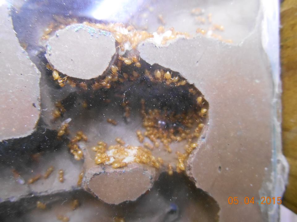 2014-05-26 - Oggi effettuato trasferimento forzato della colonia.. Ormai non ci stavano + e le operaie portavano le larve fuori nelle buche che usavo per inumidire. Ora ho fatto un formicaio in gasbeton orrizzontale con lastra di vetro. Tutto è andato piuttosto bene anche se ci sono stati attimi di tensione. Il formicaio spero che mi duri un anno almeno stando ai presenti ritmi di nascita. Direi che per essere una colonia di solo 1 anno stiamo parlando di numeri spaventosi..
