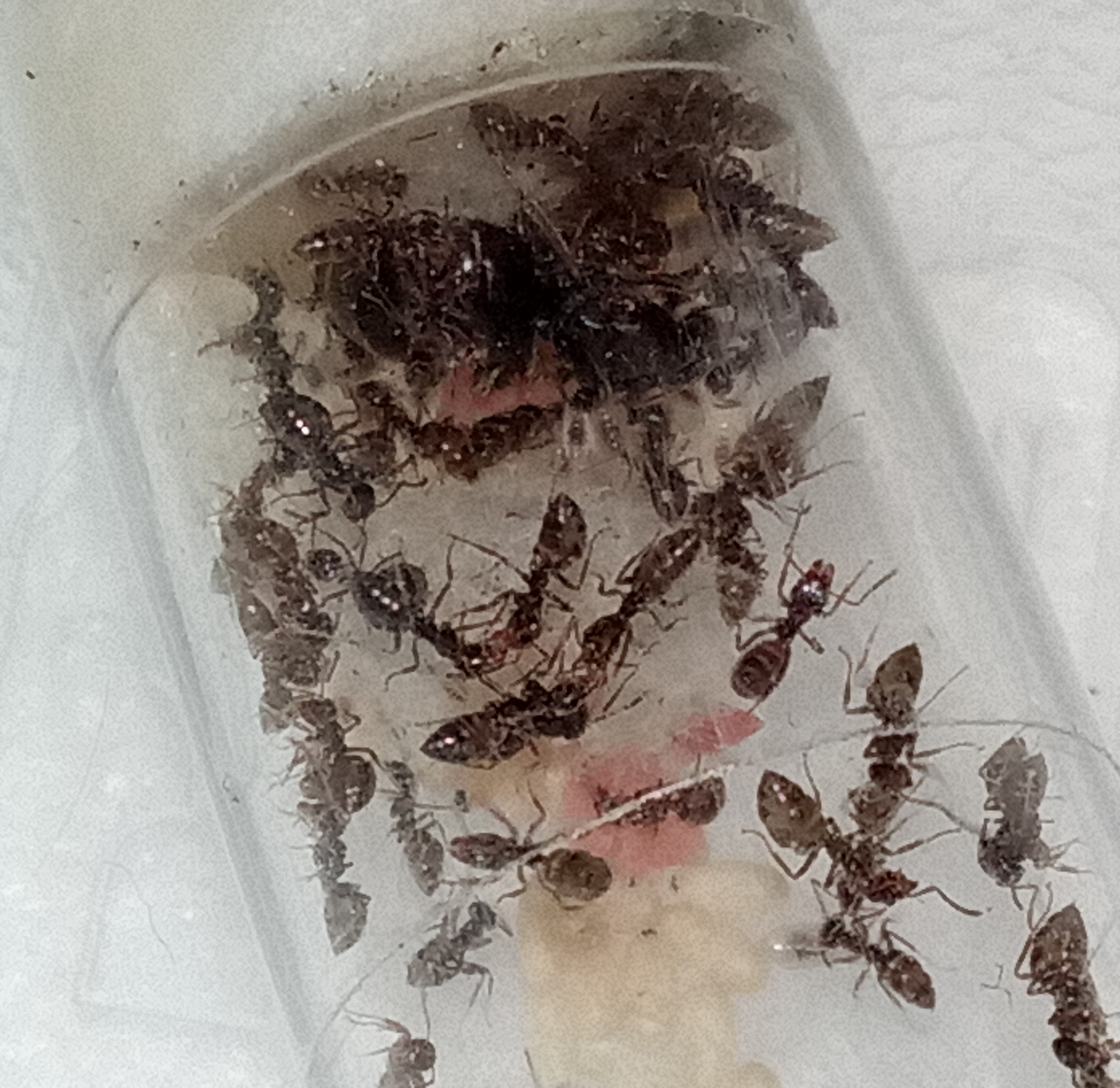 Rapido aggiornamento: la colonia è ormai nel pieno dell'attività "estiva". La covata inizia ad assumere dimensioni veramente importanti, con almeno 15-20 pupe, una ventina di larve e un numero di uova che fatico a contare (con buona probabilità più di 35-40). Probabile boom demografico in arrivo e stando ai numeri attuali pare proprio che la popolazione vada al raddoppio nel corso del prossimo mese. Visto l'aumento della popolazione ho approntato un primo formicaio di accrescimento. Il "piano" è di attendere che il numero di operaie raddoppi, portandosi intorno alle 130-150 unità, e trasferirle nel nido artificiale (formicaio in gesso a sviluppo orizzontale 15x15cm). Allo stato attuale immagino che tutto possa accadere entro 35-45 giorni da oggi. Da annotare senza dubbio anche il ritrovato appetito della colonia che divora tutto ciò che offro in arena quasi giornalmente (zanzare-mosche-piccoli ragni-prosciutto cotto e tonno per quanto riguarda le proteine; miele diluito sopra piccoli pezzi di mela per quel che riguarda gli zuccheri e carboidrati). Tutto ciò che ha dimensioni idonee ad essere trasportato all' interno del formicaio viene rapidamente selezionato e dato in pasto alle larve direttamente. L'arena è sempre pattugliata da almeno 6-7 operaie.