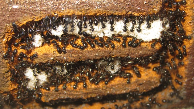 Due Giornate con Api e Formiche a Milano. In questa occasione, oberato da troppe colonie da accudire, yuri mi passa la sua colonia, in un nido in gasbeton 25 x15, verticale, faccia singola. È già evidente che prima di fine anno andranno trasferite, perché la covata presente è notevole, e per fortuna che le formiche sono piccole! La prima cosa che salta all’occhio è proprio il perfetto ordine in cui le operaie gestiscono gli stadi di crescita della covata: stanza della regina, delle uova, uova appena schiuse, larve piccole, larve medie, bozzoli… tutto ben separato, ben gestito. Le formiche lucide sono indaffaratissime e sembrano instancabili.
