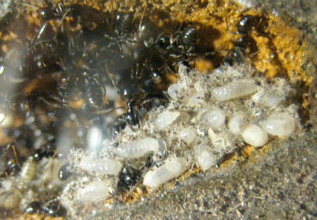 3 Settembre – La colonia gode ottima salute e la regina depone come mai ho visto fare. In agosto gruppi infiniti di uova hanno riempito le stanze colorandole di bianco, e queste uova sono diventate larve mentre la regina aveva ancora il gastro incredibilmente dilatato. In data odierna le deposizioni sembrano essersi interrotte, mentre c’è un bel cumulo di bozzoli e centinaia di larve. Aspetto e mi regolerò di settimana in settimana su come comportaarmi con questa colonia.