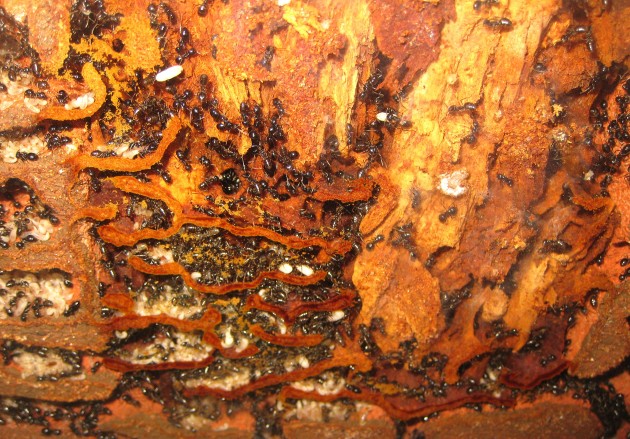 C’è un momento, che pensiamo sia il declino della colonia ospite, in cui L. fuliginosus inizia a trasferirsi alla base degli alberi, e poi al suo interno. Si sa per certo che può sviluppare le sue strutture anche sotto terra, e che non è legata a un tipo di albero particolare. Si sa anche che il colore della struttura è influenzata dal tipo di legno usato come base principale… ora lo vedremo.