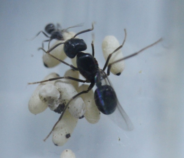 La regina si alimenta sia da sola che per trofallassi con le operaie che, rispetto alle altre colonie, sembrano meno precise nel seguirla. La regina presenta inoltre addome molto poco estroflesso rispetto a quello delle altre coloniette della medesima specie...segno evidente che comunque non sembra riuscire a partire.