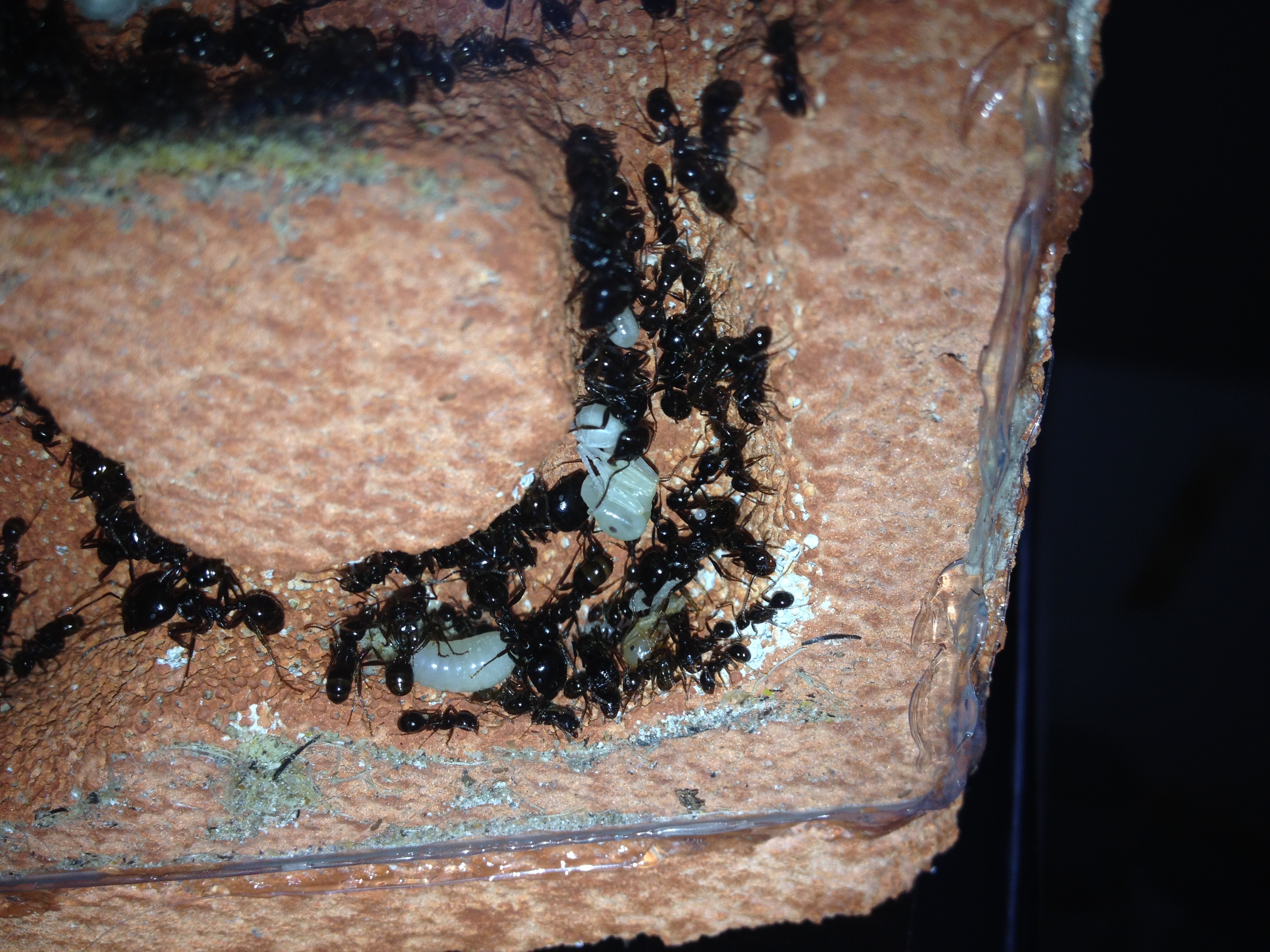 che sono ancora allo stadio pupale. La cosa molto interesante è stata notare come durante tutta la crescita delle larve non è stata cresciuta nessun'alta covata o quasi nonostante l'abbondanza di operaie, cibo, calore ed umidità. Questo potrebbe essere indice che lo sviluppo di queste caste richiede un abbondante quantità di proteine fornite sotto forma di uova bloccando cosi la produzione di operaie.