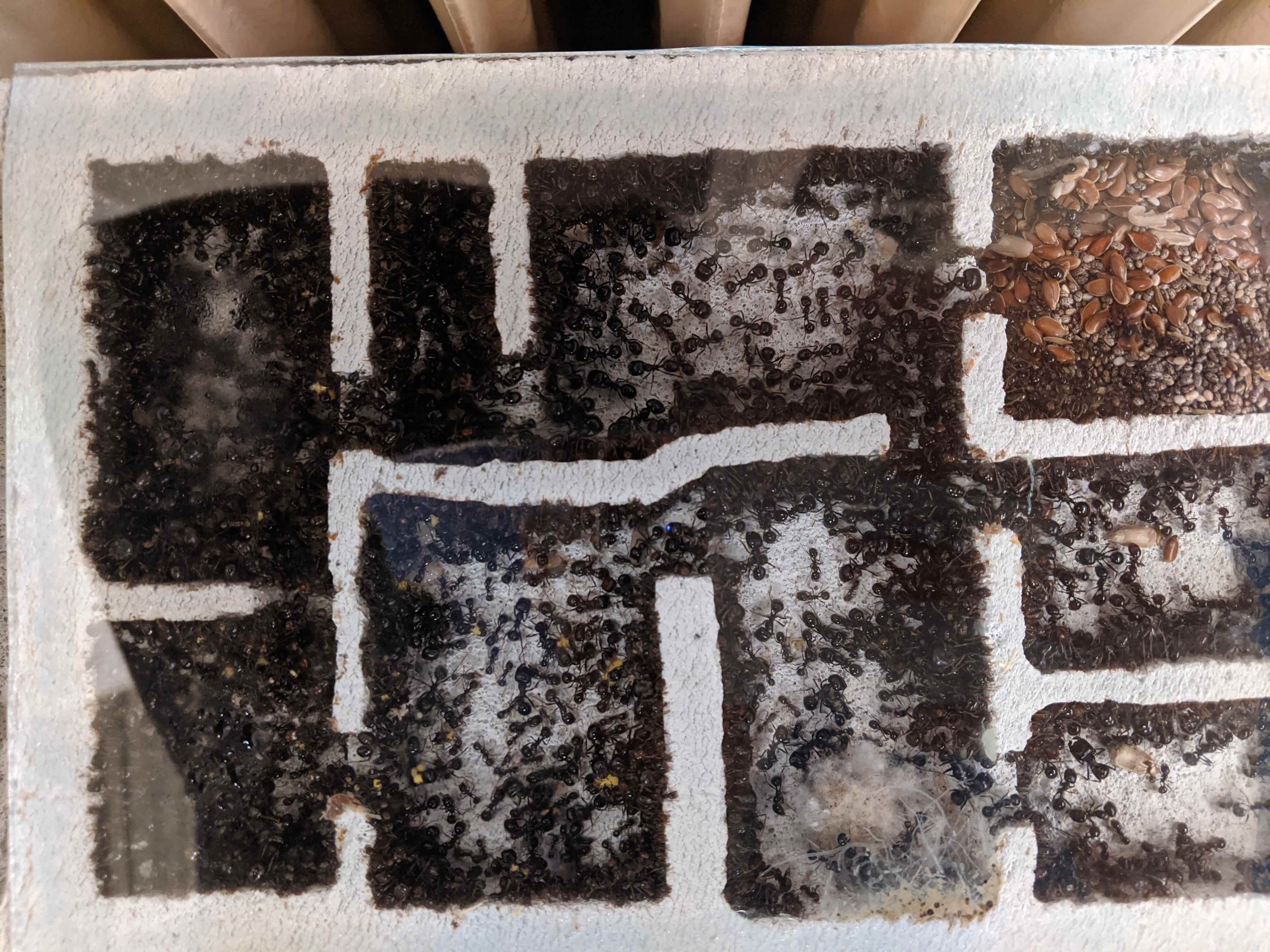 Comunque, all'inizio il nido era molto idratato e con mia grande meraviglia hanno cominciato a scavare (non avevano mai limato nemmeno uno spigolo in 2 anni!). Dopo un po' si sono fermate e sembrano aver usato i proventi dello scavo per tappare l'intercapedine tra vetro e parete. Ho poi smesso di idratare per paura di evasioni e appena il nido si è seccato ci hanno appunto messo molti semi. Ora purtroppo da me è tornato il freddo polare e la stanza è scesa ai 14 gradi, spero torni il caldo così anche loro ripartono.