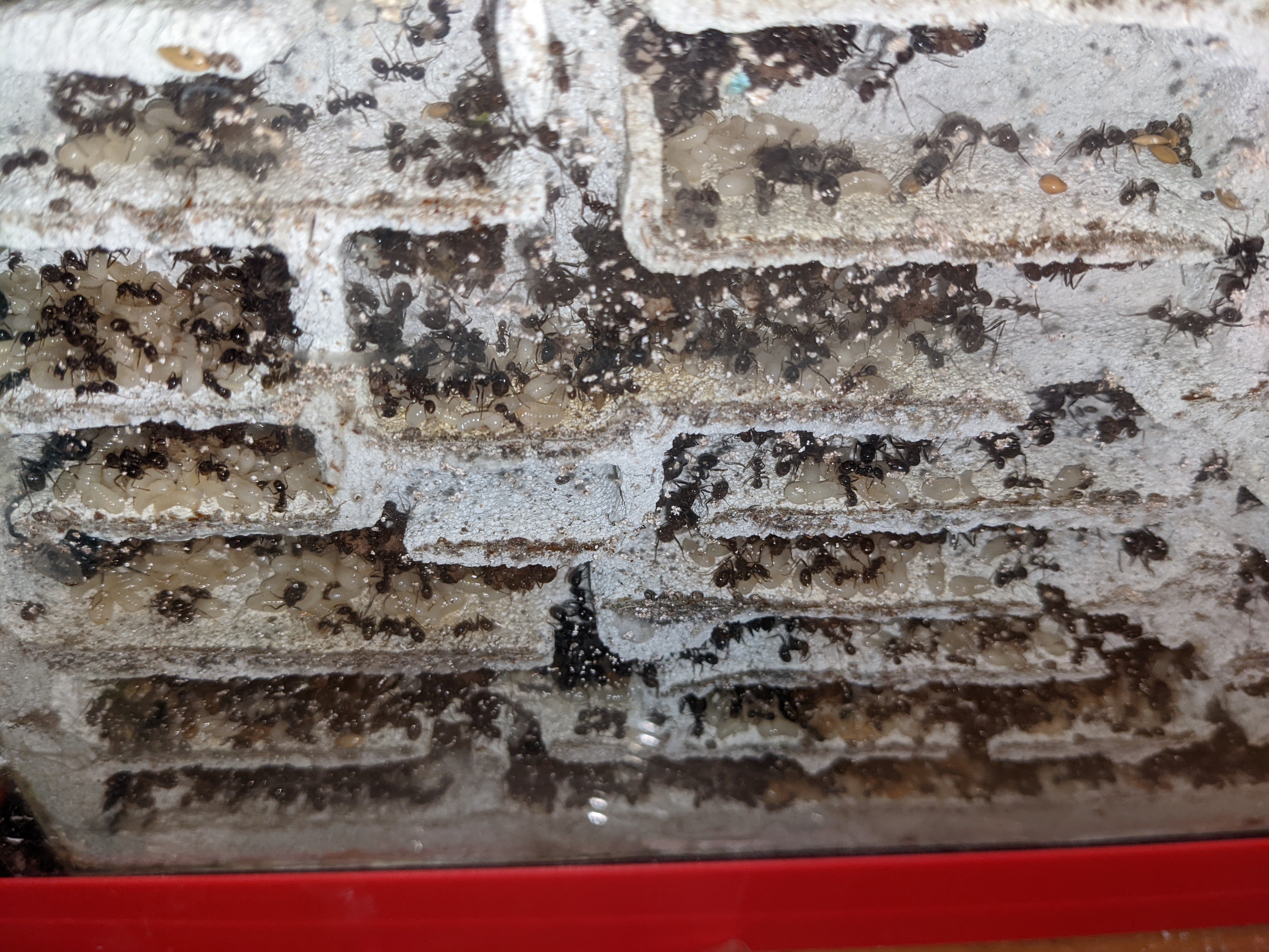 Tra università e impegni vari sono stato davvero poco a casa e quindi non ho molte foto da mostrarvi. Ora però la covata è aumentata sensibilmente e stanno sfarfallando le prime operaie ancora non del tutto pigmentate. Purtroppo le stanze non garantiscono ottima visibilità (soprattutto quelle più basse nella zona bassa del nido) e non sono sicuro se ci sia un sacco di altra covata nascosta sul fondo. Le formiche sono tornate voracissime e mangiano di tutto. Ho problemi a trovare insetti freschi ma apprezzano anche prosciutto e uova. Hanno allungato le zampe anche su qualche pezzo di frutta.