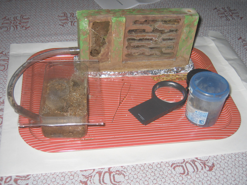 Finalmente, spinto dalla necessità di poter VEDERE quello che succede nella mia piccola colonia, il 1 ottobre ho terminato il nido di gesso e passo a travasare direttamente il vasetto di terra nell’arena esterna al quale l’ho collegato: il panico è generale, ma già la mattina dopo il ribaltamento (eseguito la sera tardi), la regina, parte delle operaie e tutte le uova e larve, sono al sicuro nelle stanze di gesso!