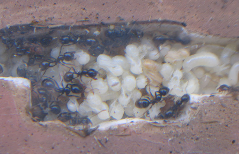 1 Marzo: Ho potuto constatare che alcune delle prime uova deposte questa primavera (quindi da pochissimo), si sono già trasformate in minuscole larve. Ad una osservazione accurata, ma cercando di non disturbare la colonia, le uova visibili sono più di un centinaio, ma dato l’affollamento e la presenza di una covata sviluppata già abbondante, non escludo che ce ne possano essere molte altre nascoste dietro gli ammassi di pupe e larve.