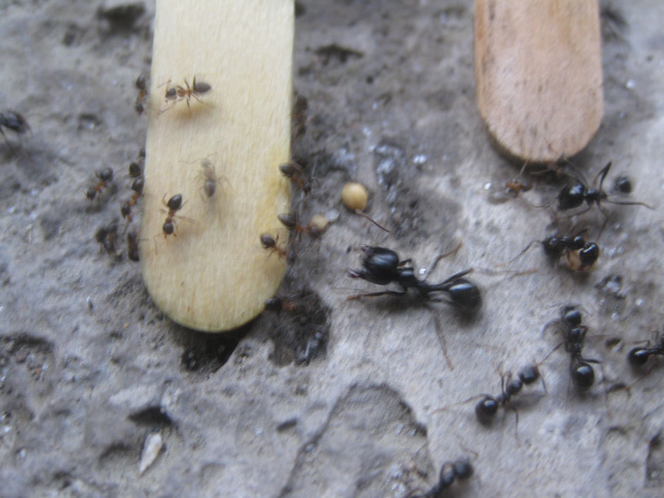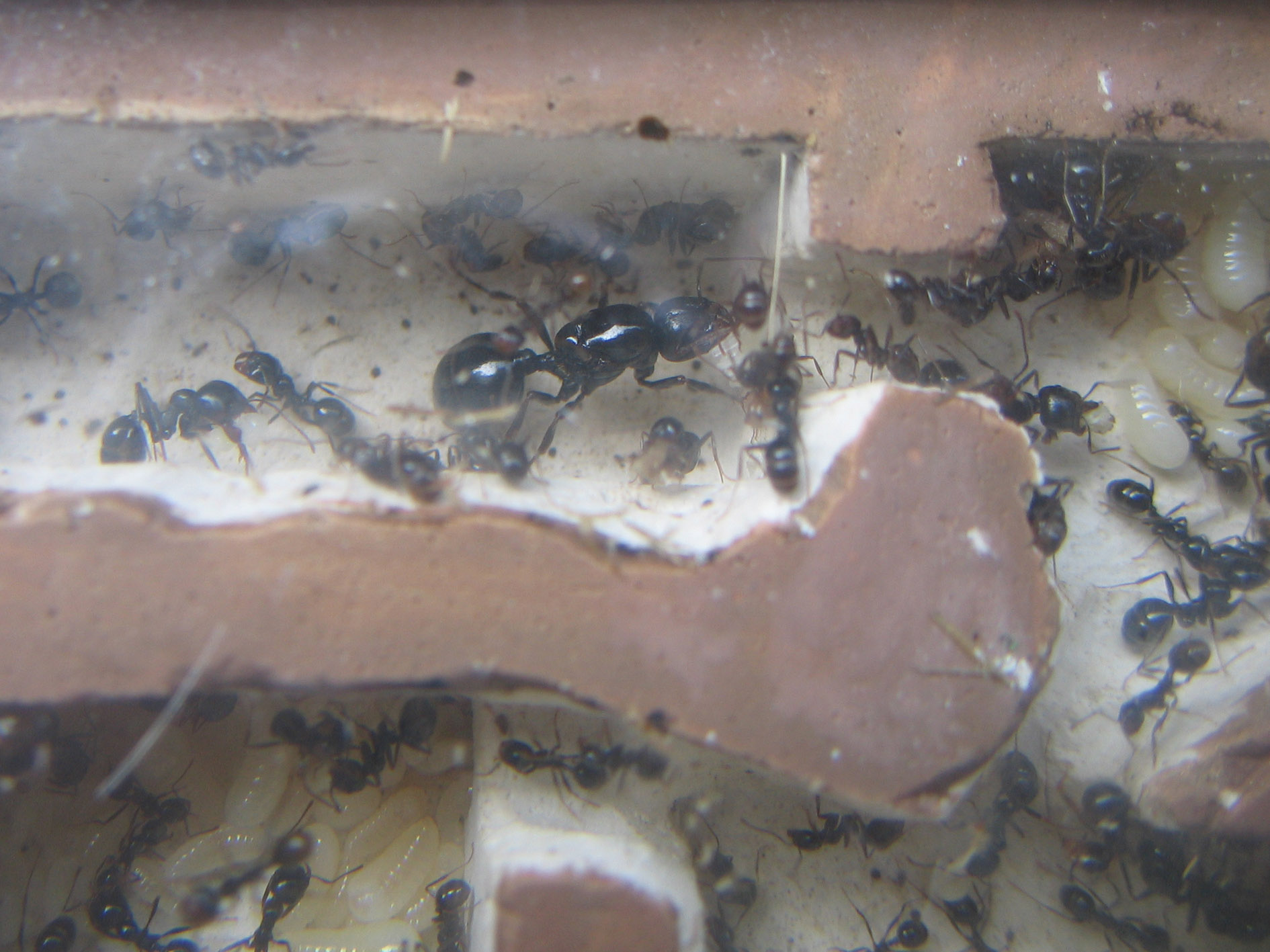Ci ho messo quasi due giorni a trasferire tutta la popolazione nella nuova sede, per stressare e ferire meno operaie possibile. Ho tirato un sospiro di sollievo quando ho trovato la regina in ottime condizioni. Appena messa nel terreno libero, è stata trascinata al sicuro nel nido di gesso, seguita poi da larve e provviste (qualche centinaio le larvette al primo stadio).