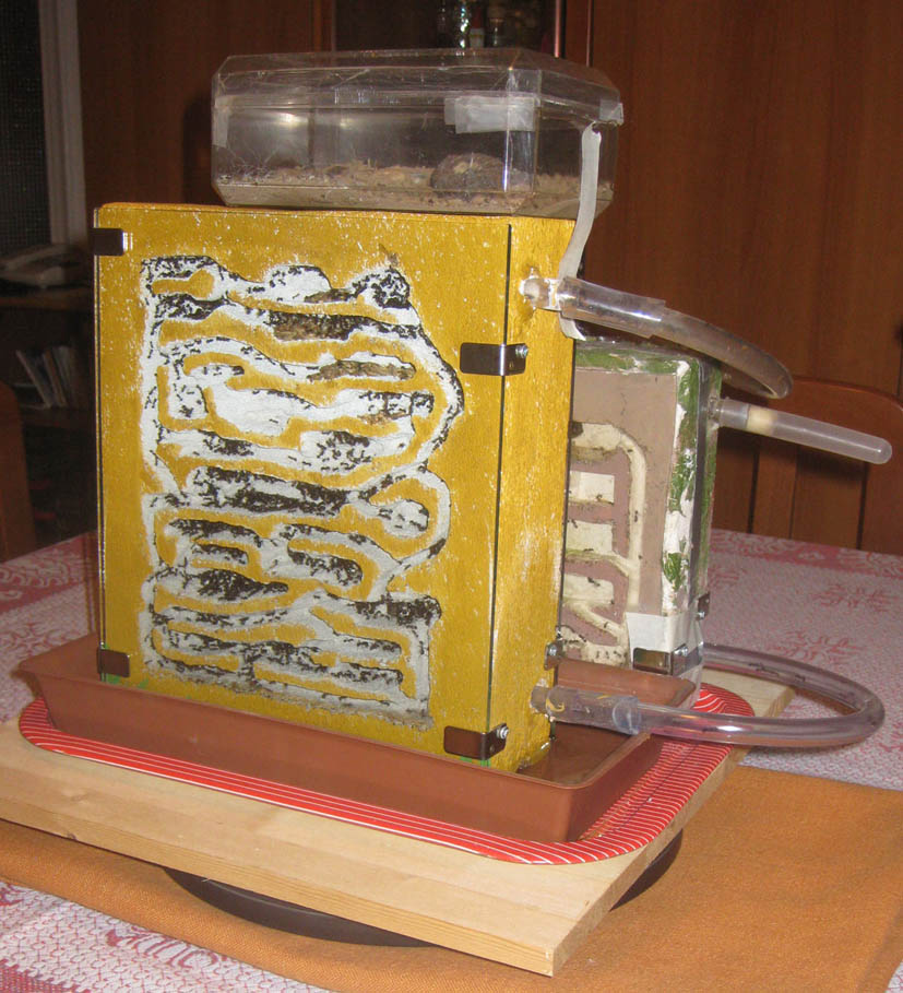 Nel 2008, anche a causa di una moria di pupe avvenuta in primavera penso dovuta a qualche infestazione di muffe, mi sono convinto che forse l’ermeticità e l’umidità del gesso non erano più salutari per la popolazione. Così ho deciso di rimettere la colonia in terrario, come alle origini.