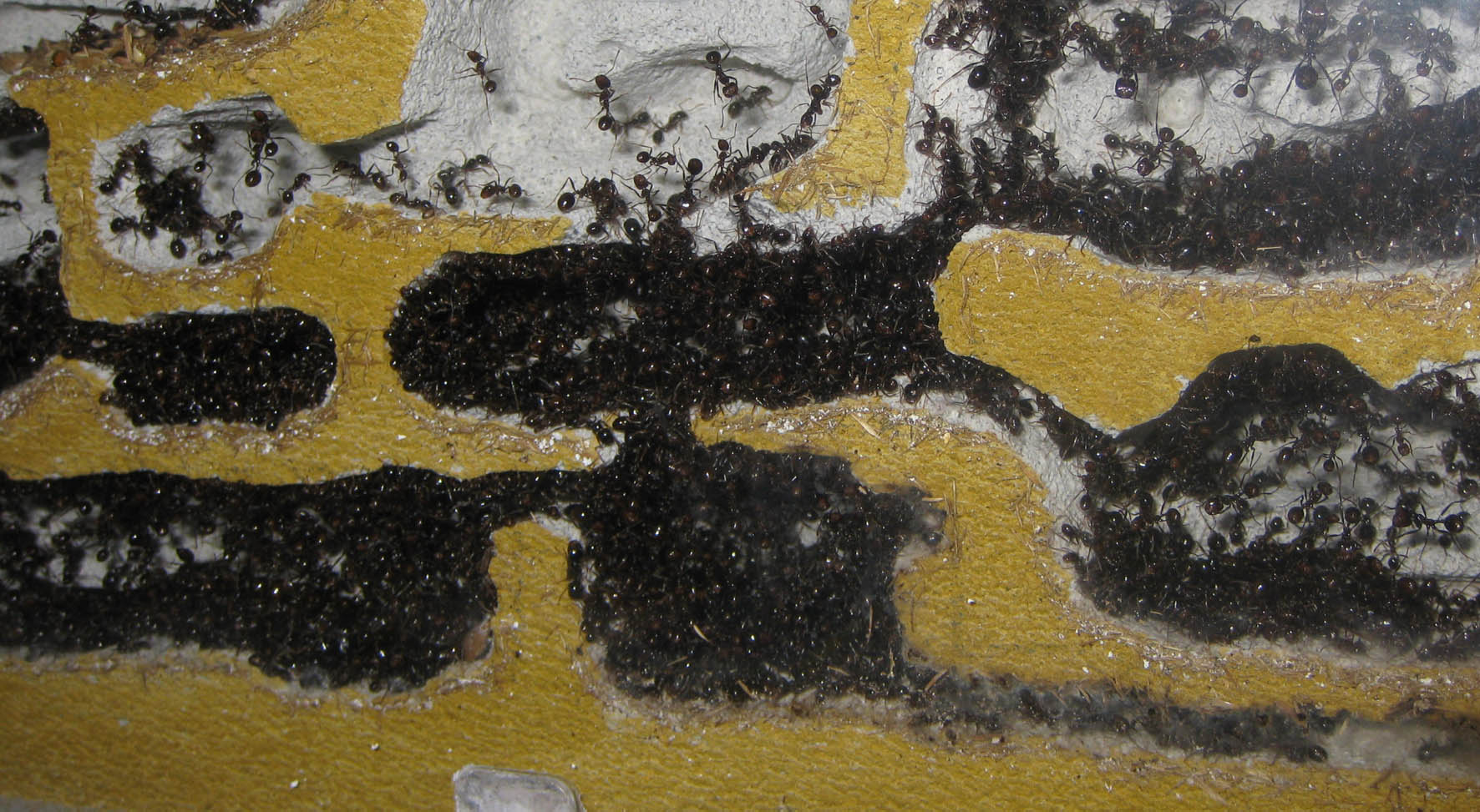 Ad aprile ho deposto le strutture di gesso in un più ampio terrario e ho lasciato che fosse la colonia stessa a decidere quando e se trasferirsi; in realtà l’ha fatto senza nessuna fretta, e ha continuato ad abitare anche alcune sezioni di gesso, ma i grandi scavi che si sono susseguiti per i mesi successivi sembrano aver alzato il morale della truppa.