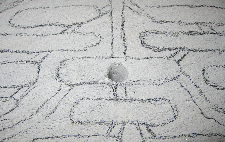 … Così, quando ho i punti d’uscita corrispettivi, creo a matita un nuovo disegno per la pianta della seconda facciata cercando di variare l’effetto rispetto al precedente. Posso ora scavare la seconda parte del nido, cosa che richiede altre due ore.