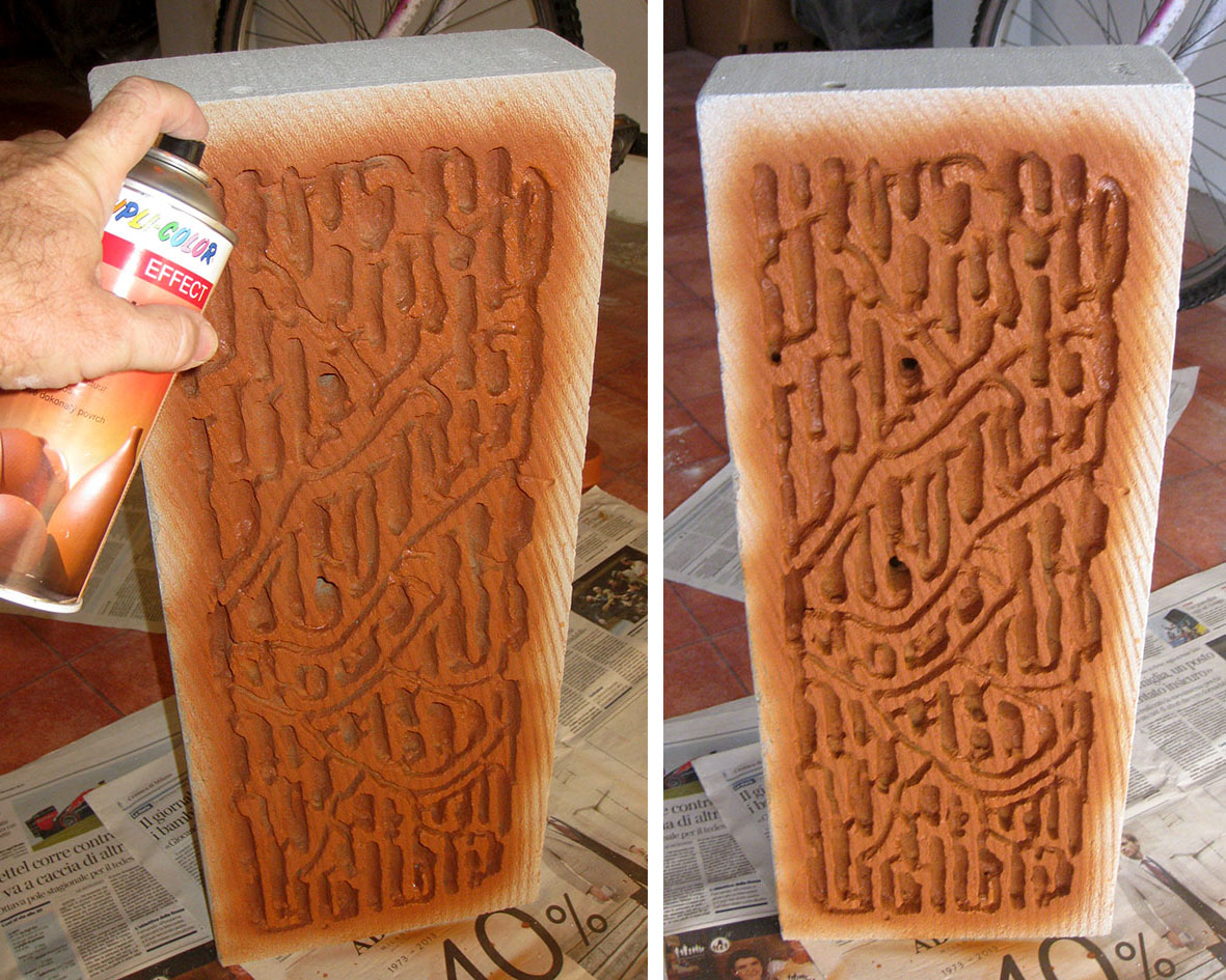 Lasciato asciugare per alcune ore in ambiente asciutto il blocco, metto un colore di contrasto, che permetterà alle gallerie interne d’essere più visibili sul fondo. In questo caso dovrò usare un pennello e della tempera diluita, altrimenti sarei costretto a mascherare tutte le gallerie e ne risulterebbe un lavoro improbo.
