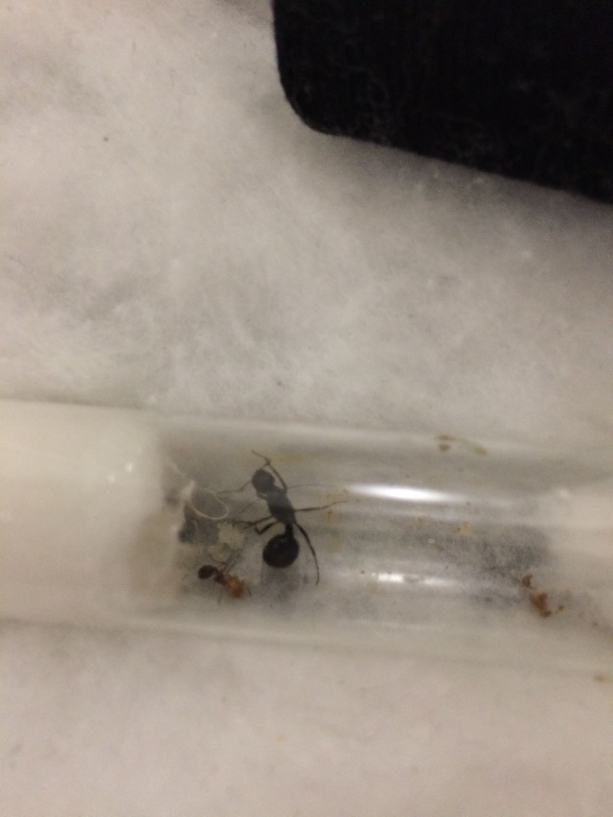 Buongiorno ragazzi! Ieri sera ho fatto un cambio di provetta. Ho collegato con lo scotch trasparente la provetta vecchia a quella nuova, stamattina si erano spostate in quella nuova quindi le ho staccate e ho tappato coon cotone quella nuova. La regina è in buona forma, l'operaia idem. Ho notato 7 belle pupe !! Una nuova perché l'altra settimana non c'era le altre sono tutte con la parte dietro nera e il corpo si sta colorando di nero testa giallo scura.. una pupa e molto più grande delle altre, le altre sono piccoline. Noto una bella covata nuova anche quella di un ventina di uova e una larva gigante che sta li da un po' di tempo.. a breve foto!