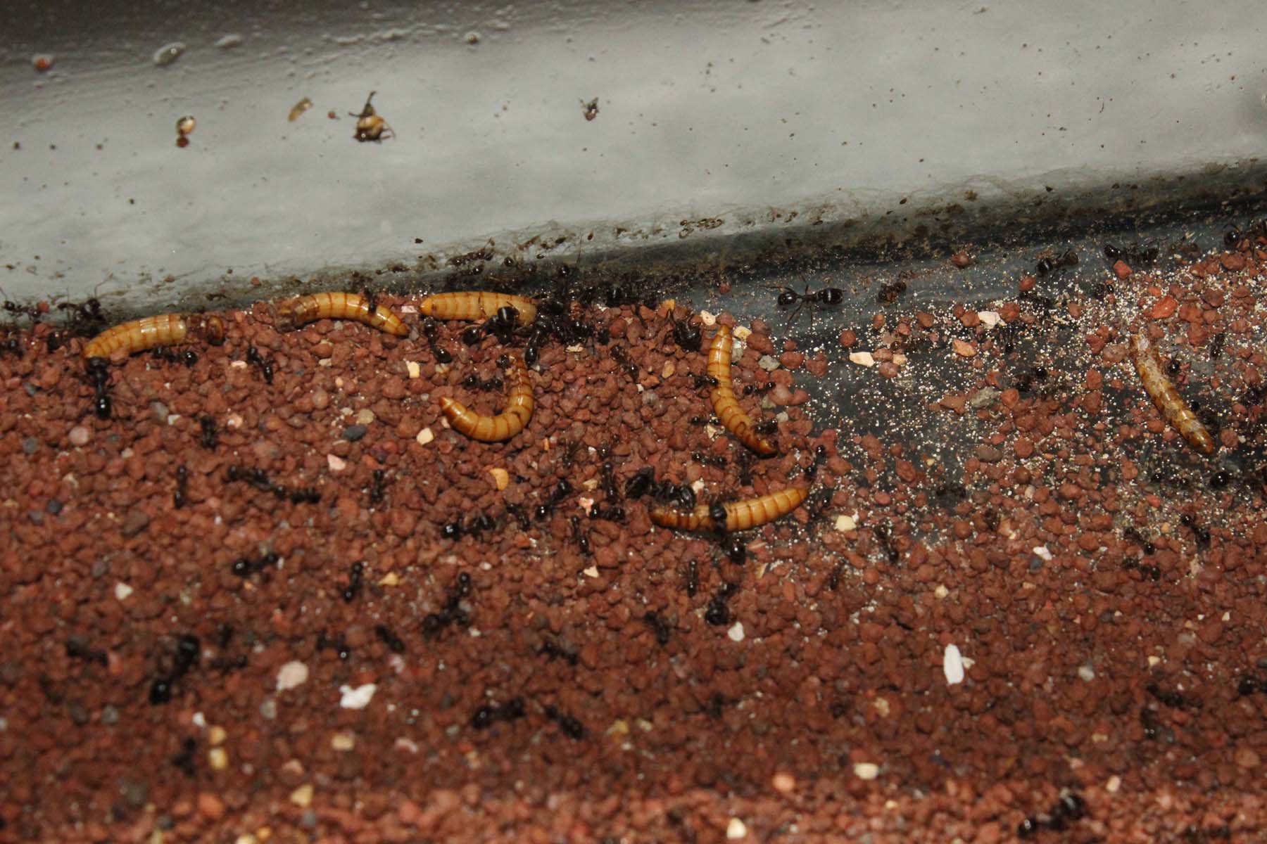 Ed ecco una panoramica dell'arena e delle operaie intente a cacciare delle camole della farina. Per tenere occupata la colonia, ormai do loro le camole vive e intere. In questo modo restano occupate nei lavori di reclutamente o uccisione per un intero giorno. La colonia mangia 10-12 camole a giorni alterni...per un totale di circa 40 camole a settimana.