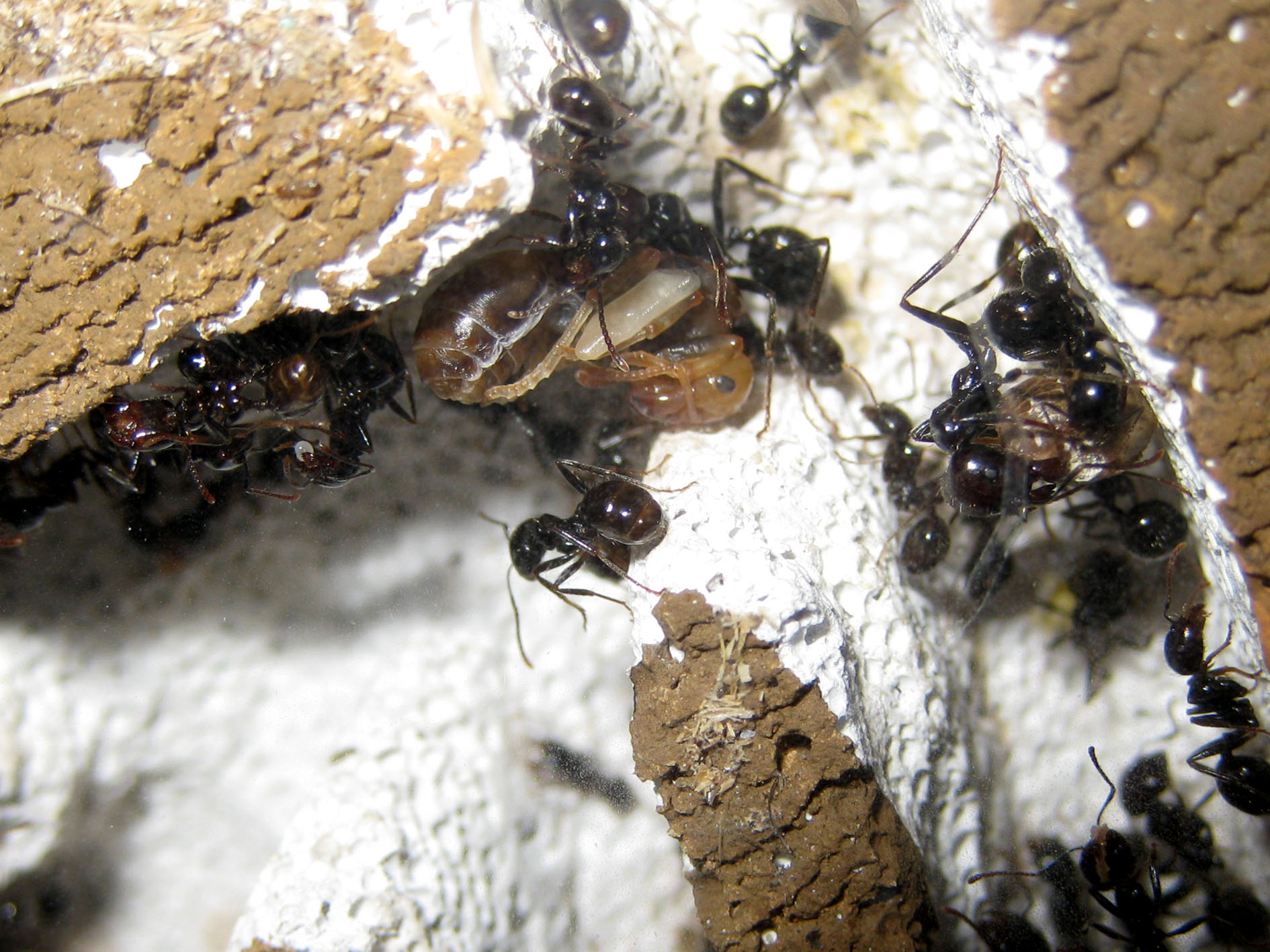 Intanto vi posto alcune foto scattate che mettono in evidenza alcune similitudini nel comportamento della mia colonia e della sua, che sono: la presenza di alcune regine che si comportano come operaie (dealate); la nascita di un numero di operaie piccole superiore a quella dei soldati prima della produzione di alati; la pigmentazione dei maschi in tonalità nero-grigio e delle regine tendenti al rossiccio.