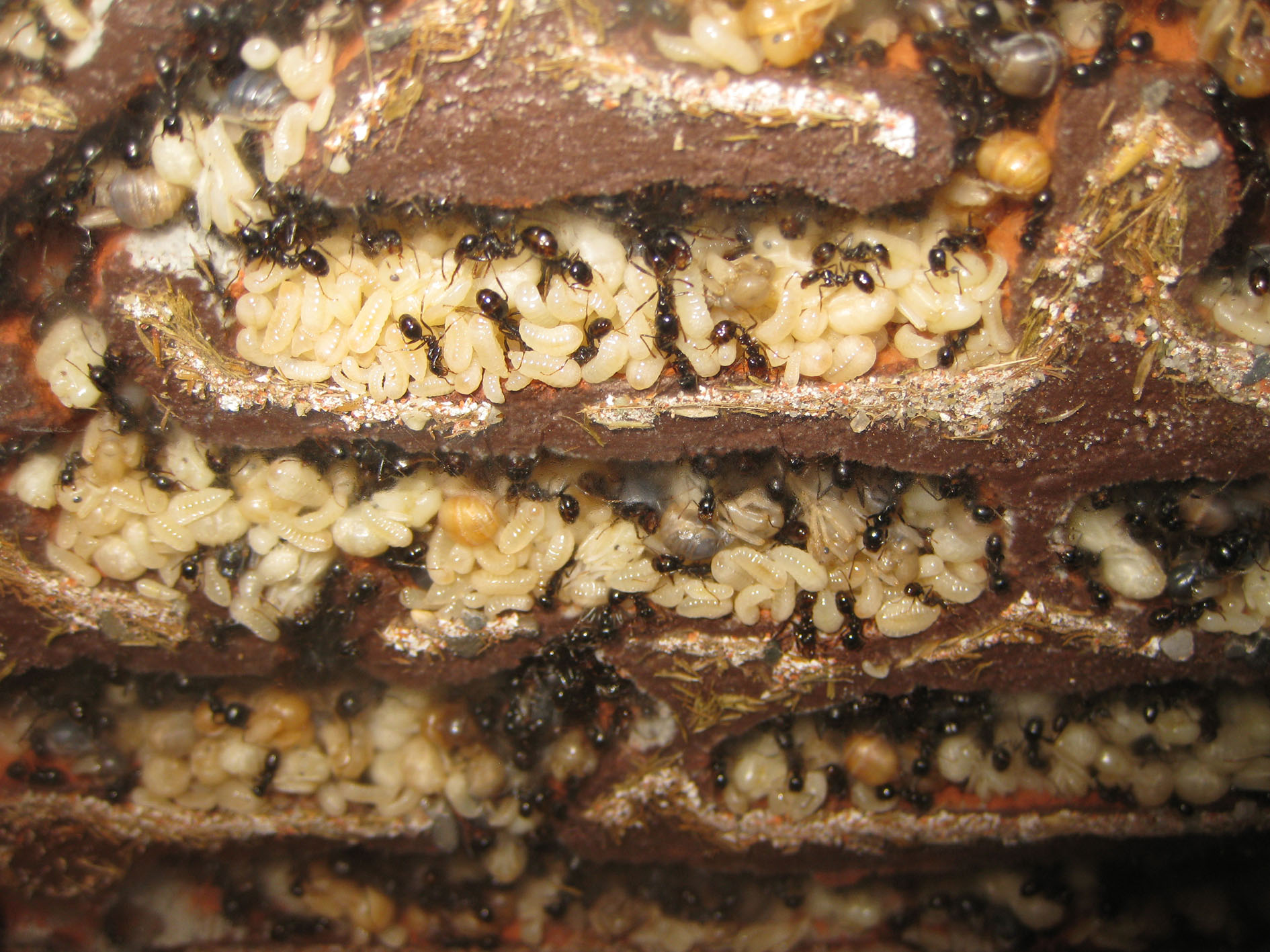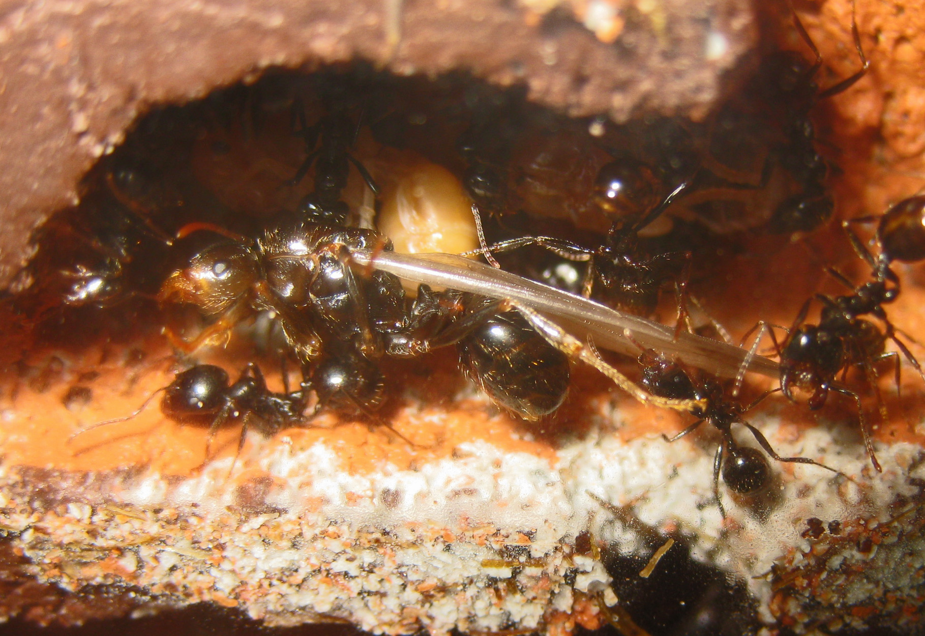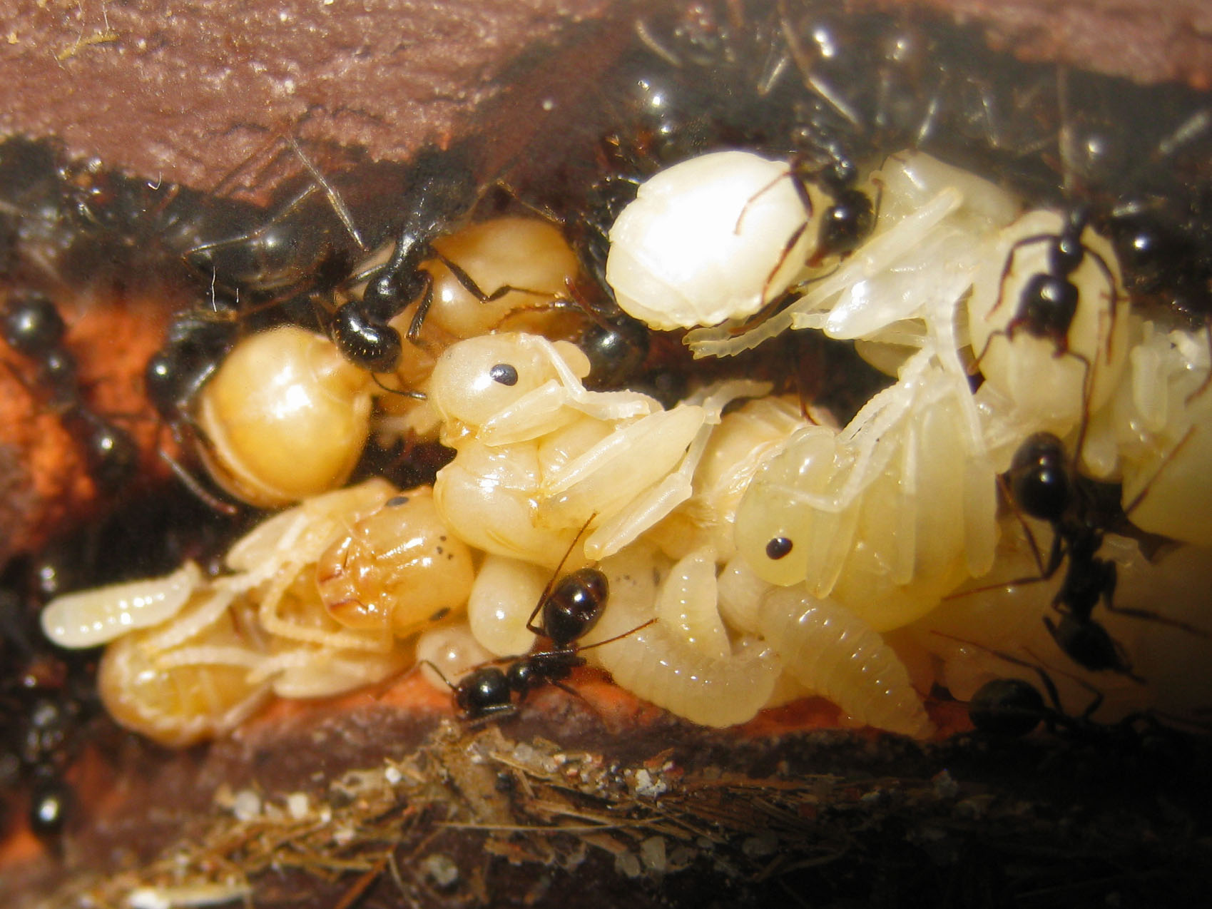 Un primo particolare da notare: le pupe sono sempre tenute in questa posizione da un'operaia addetta; la presa è regolarmente sul peziolo, la parte più sottile afferrabile da una singola operaia, ma potete anche osservare la cooperazione di più operaie piccole disposte a "ragno” che sorreggono una singola pupa in una rete di zampe e mandibole.
