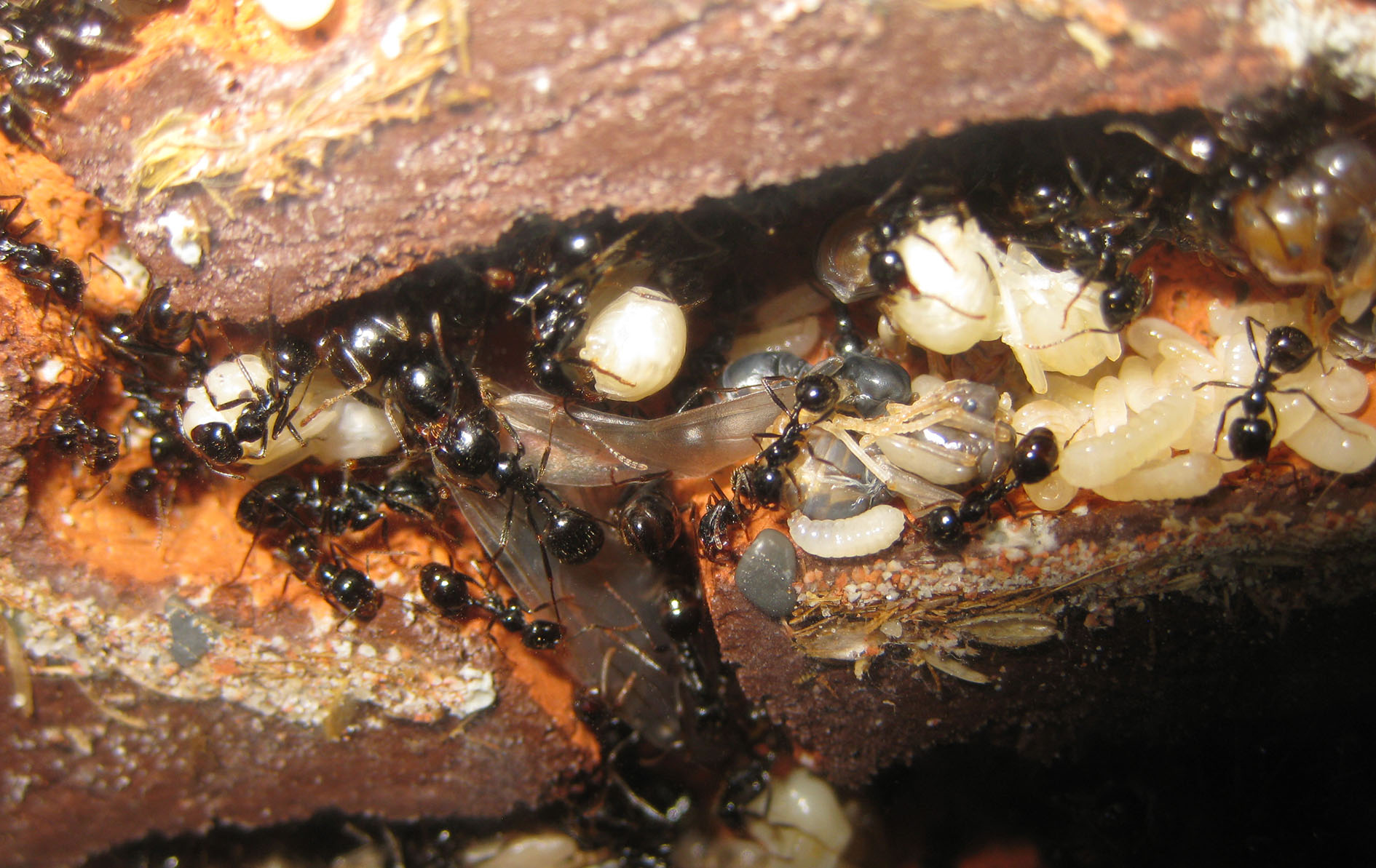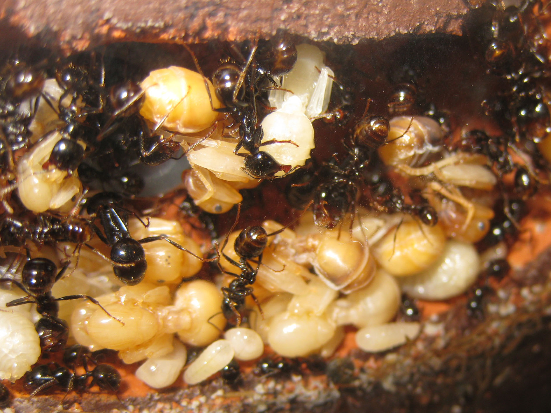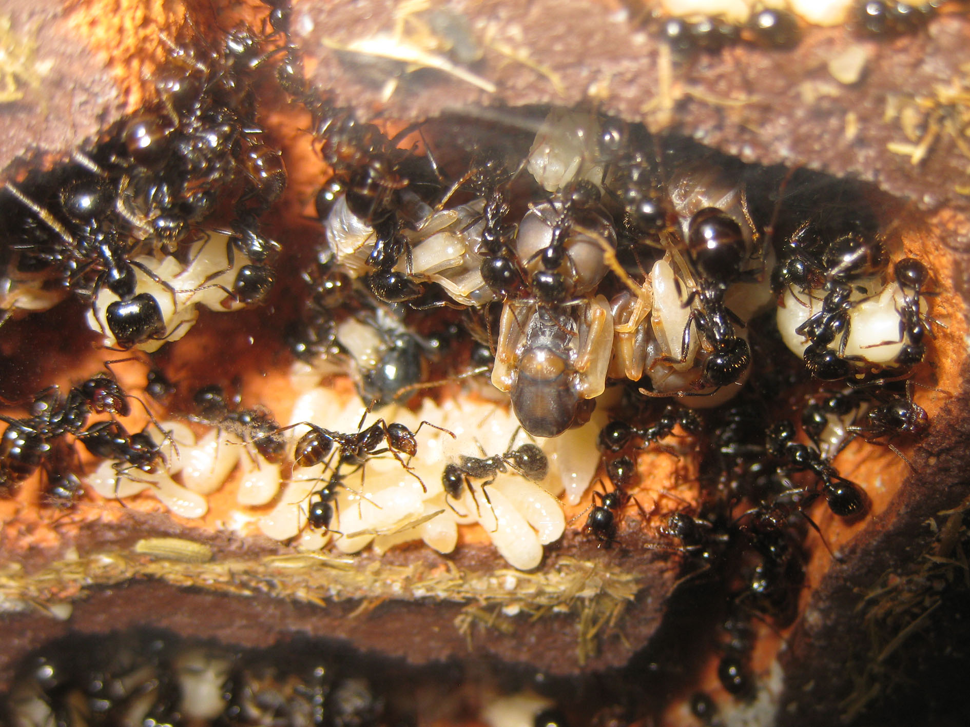 Un primo particolare da notare: le pupe sono sempre tenute in questa posizione da un'operaia addetta; la presa è regolarmente sul peziolo, la parte più sottile afferrabile da una singola operaia, ma potete anche osservare la cooperazione di più operaie piccole disposte a "ragno” che sorreggono una singola pupa in una rete di zampe e mandibole.