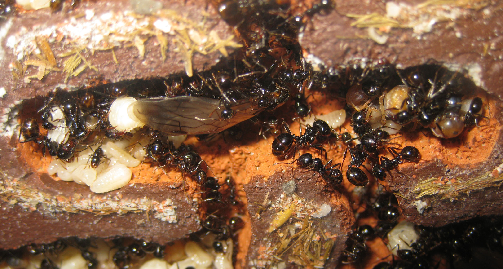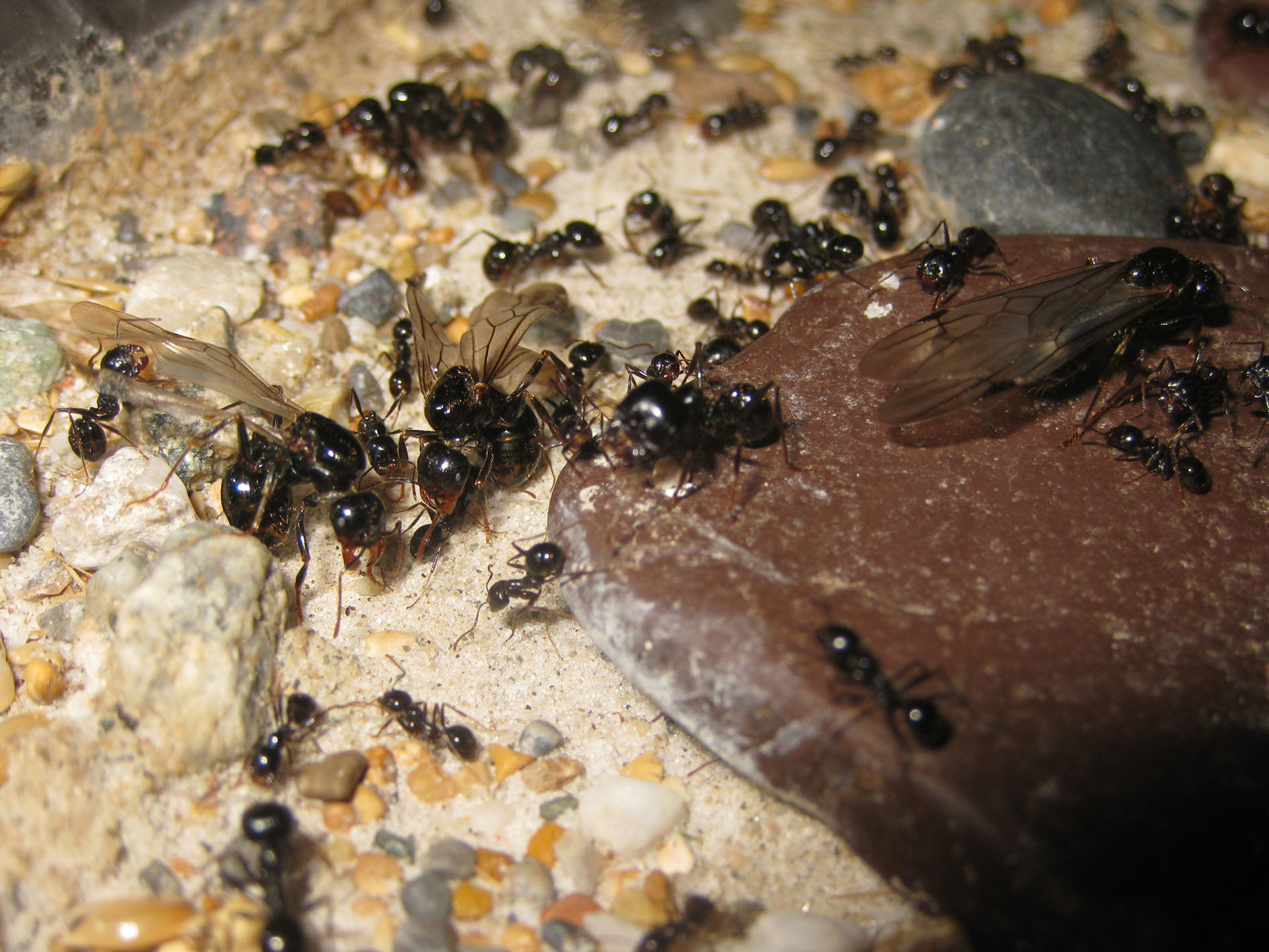 in cattività vi sono strani fenomeni riguardanti i sessuati, magari problematiche di ormoni, i nostri nidi sono molto più densi di quelli in natura, o magari relativi alle operaie anziane, non avendo un tasso di mortalità alto come in natura vi è la presenza di molte più operaie vecchie che magari hanno ormoni più forti????