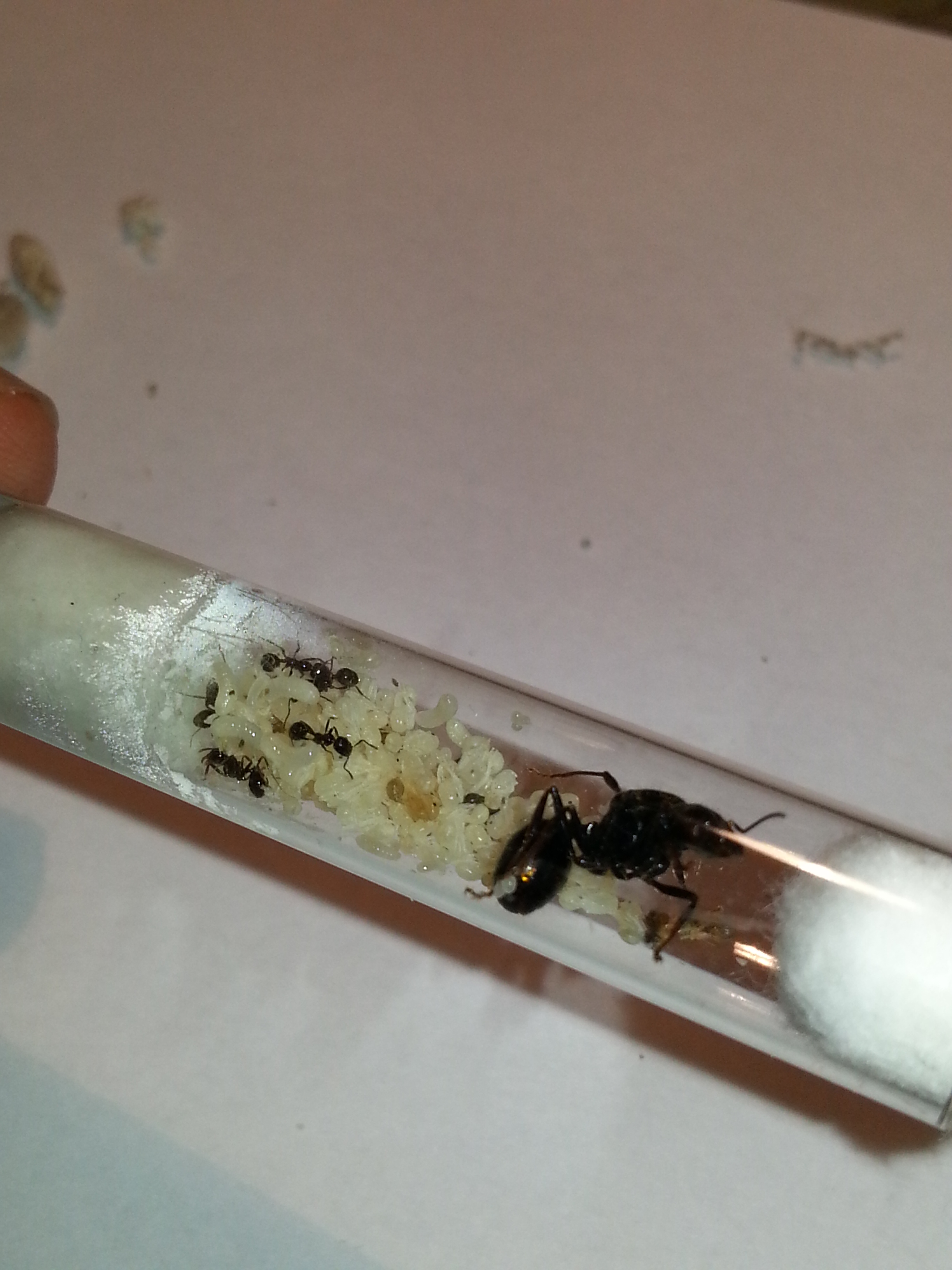 nella foto dove vi sono diverse ninfe (una cinquantina) e molte più operaie (una trentina ho deciso di inserire una blatta morta, nell'altra con circa 10 operaie e diverse larve e molte uova ho inserito una piccola falena.