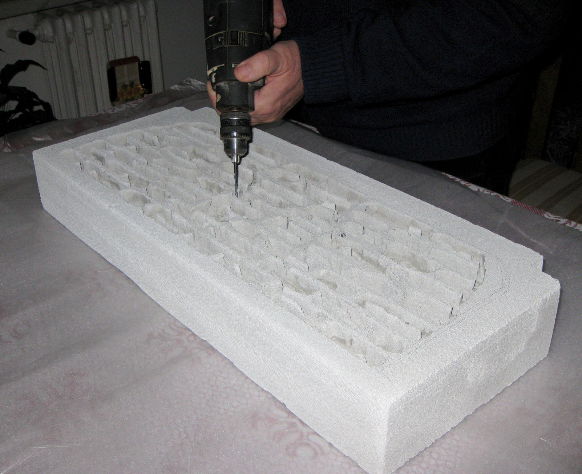 Ho tracciato il disegno iniziale posizionando solo le stanze, che saranno circa 80. In seguito le ho tracciate con il trapano a punta fine, e ho usato una punta più larga per ricavare le stanze vere e proprie. Quando ho ottenuto la posizione definitiva delle stanze ho progettato i collegamenti ad arte, cercando un disegno più intricato ma funzionale possibile: le formiche devono poter gestire covata e granai al meglio, senza avere però la possibilità di passare da una stanza all'altra in ogni punto. L'alternanza stanze piccole-stanze grandi è stata pensata non solo per estetica visiva, ma anche per funzionalità: le più profonde al centro, le meno in basso, per limitare ulteriormente la possibilità alle formiche di nascondersi alla vista.