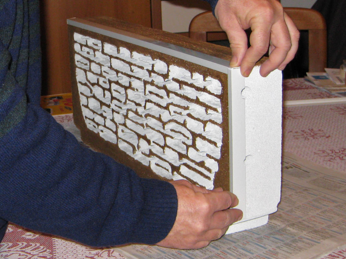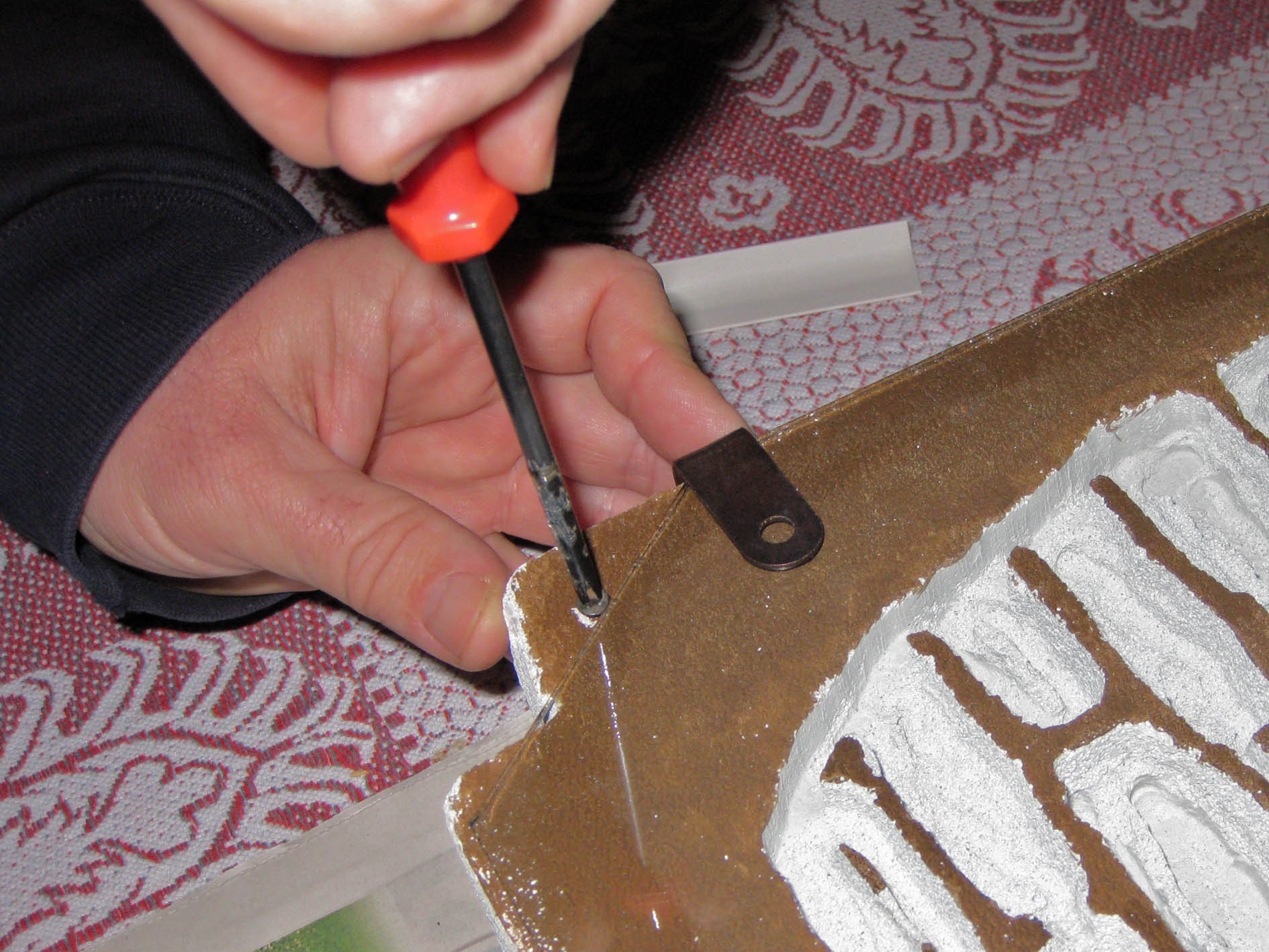 Lasciato asciugare il colore ho fissato il vetro con appositi tasselli angolari avvitati. Come sempre, i lati e il retro non verranno colorati per permettere sempre di percepire lo stato di umidificazione del materiale, dato che un alone più scuro si manifesta dove l'acqua è arrivata a saturare il bitume cellulare. Un altro guaio del gasbeton è che si danneggia facilmente; così ho applicato dei listelli su tutti gli angoli possibili per proteggerlo dagli urti.