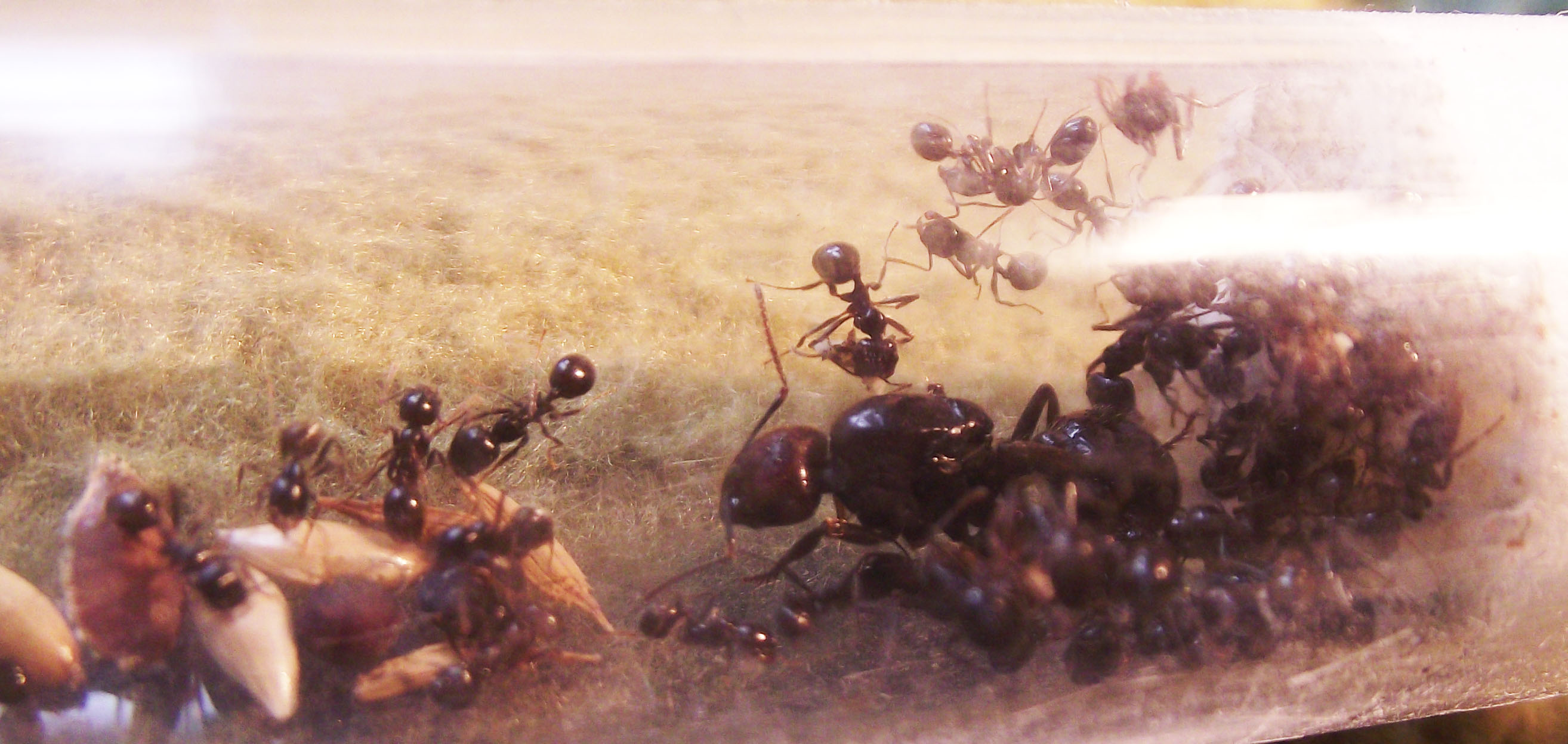 Come previsto ormai anche se all'esterno fa freddo in casa è abbastanza caldo da far risvegliare la colonia, le larve si sono impupate e mi sembra di poter dire che hanno nutrito abbastanza una larva per avere di nuovo una media nella colonia. Non accettano proteine per ora, ne camole ne pezzetti di carne, purtroppo non ci sono altri insetti per ora...Appena possibile provo con un pò di tuorlo d'uovo vedo se lo gradiscono. Non essendoci medie o major non riescono ad aprire i semi, la regina ormai non si occupa più di questo come faceva l'anno scorso, ho notato che non avevano "pane" e i semi rimanevano intatti e sempre dello stesso numero, ho provato a fornire un seme schiacciato, è stato subito portato dentro e lavorato, fino alla nascita della prossima operaia con un capo abbastanza grosso penso che dovrò aiutarle un poco, nei mix di semi non c'è una grande varietà in natura troverebbero sicuramente piccoli semi adatti a loro.