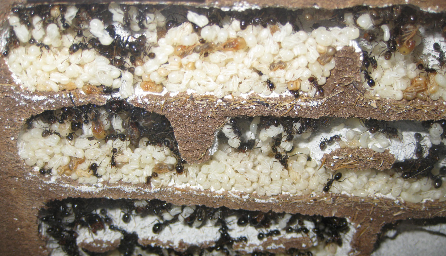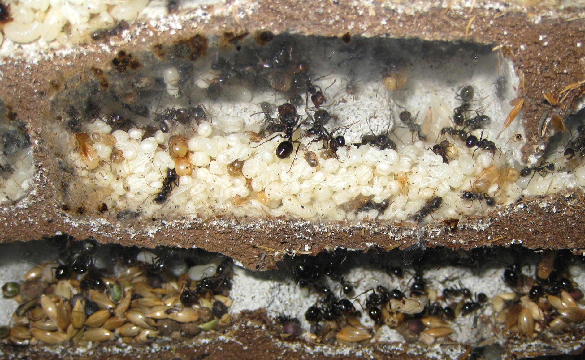 Non so nemmeno più quante possano essere le operaie, perché ci sono crescite e cali ciclici, e d'estate subiscono perdite (l'attacco di quest'anno delle Camponotus vagus, le disperse quando le lascio libere sulla finestra...); sono migliaia, ma vorrei vedere se la primavera porterà novità.