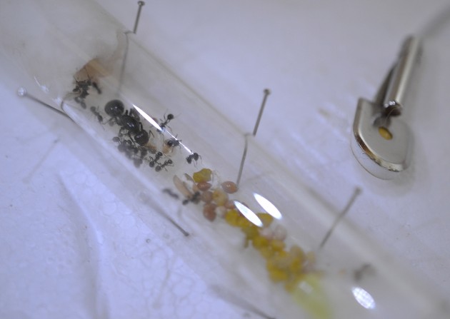 - -12.b) Una pupa (pronta a sfarfallare) viene accudita dalla regina mentre le 8 operaie le rimangono accanto. All'interno della provetta si possono notare semi (masticati e non) accumulati al centro, il pezzo di prosciutto (anch'esso posto nel 'magazzino' centrale) ed una goccia di siero posizionata su un frammento di stagnola.