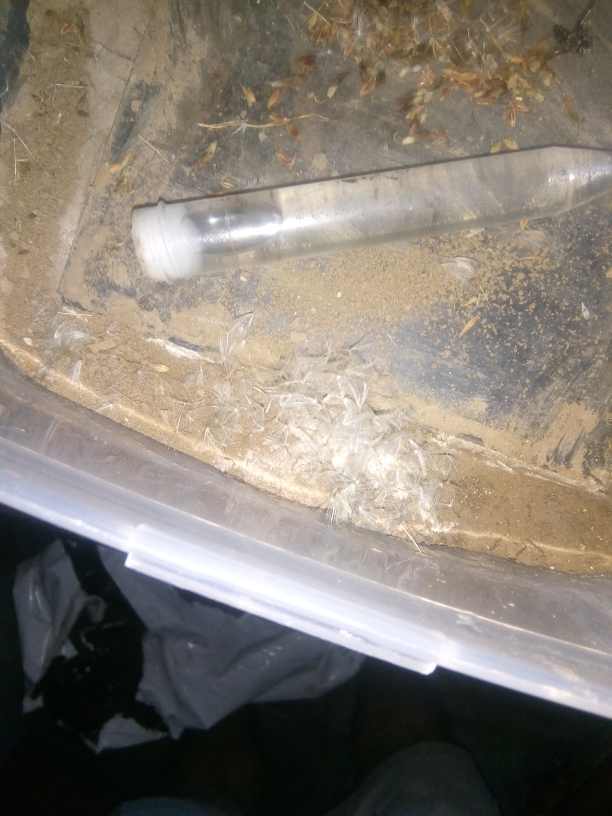 Nell angolo piu secco del nido hanno allestito la discarica,rimuovo regolarmente la pula di semi vuoti,soffioni rinsecchiti( li usano come tappo finche sono freschi) e pezzi di esoscheletro di insetto.