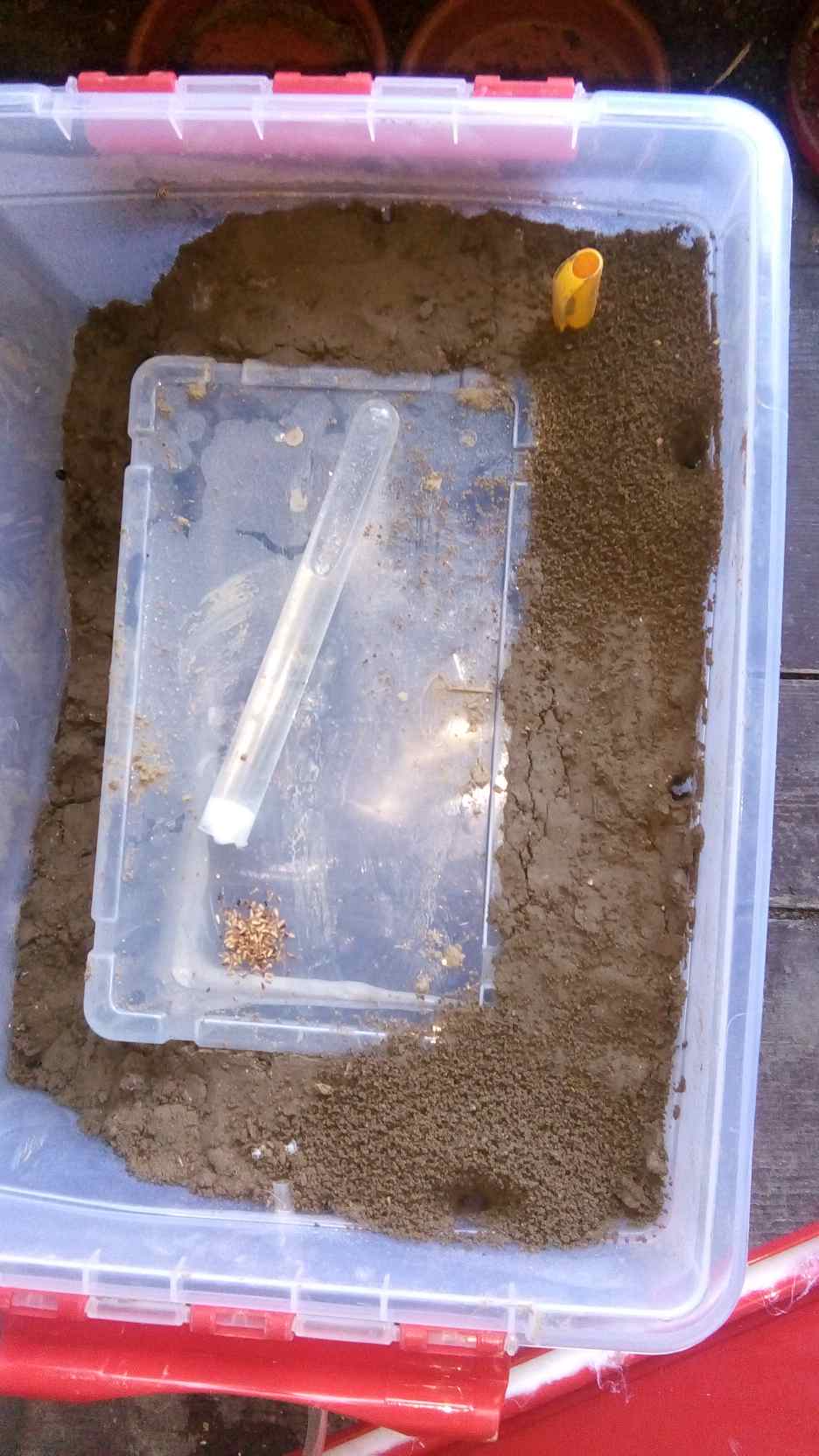 Ieri la colonia era tranquilla ,tutto procedeva come al solito, stamattina invece in provetta sono rimasti solo i semi mentre regina,operaie,larve e pupe si sono trasferite nel nido di terra argillosa e dura scavando nell area piu umida,sono molto soddisfatto!