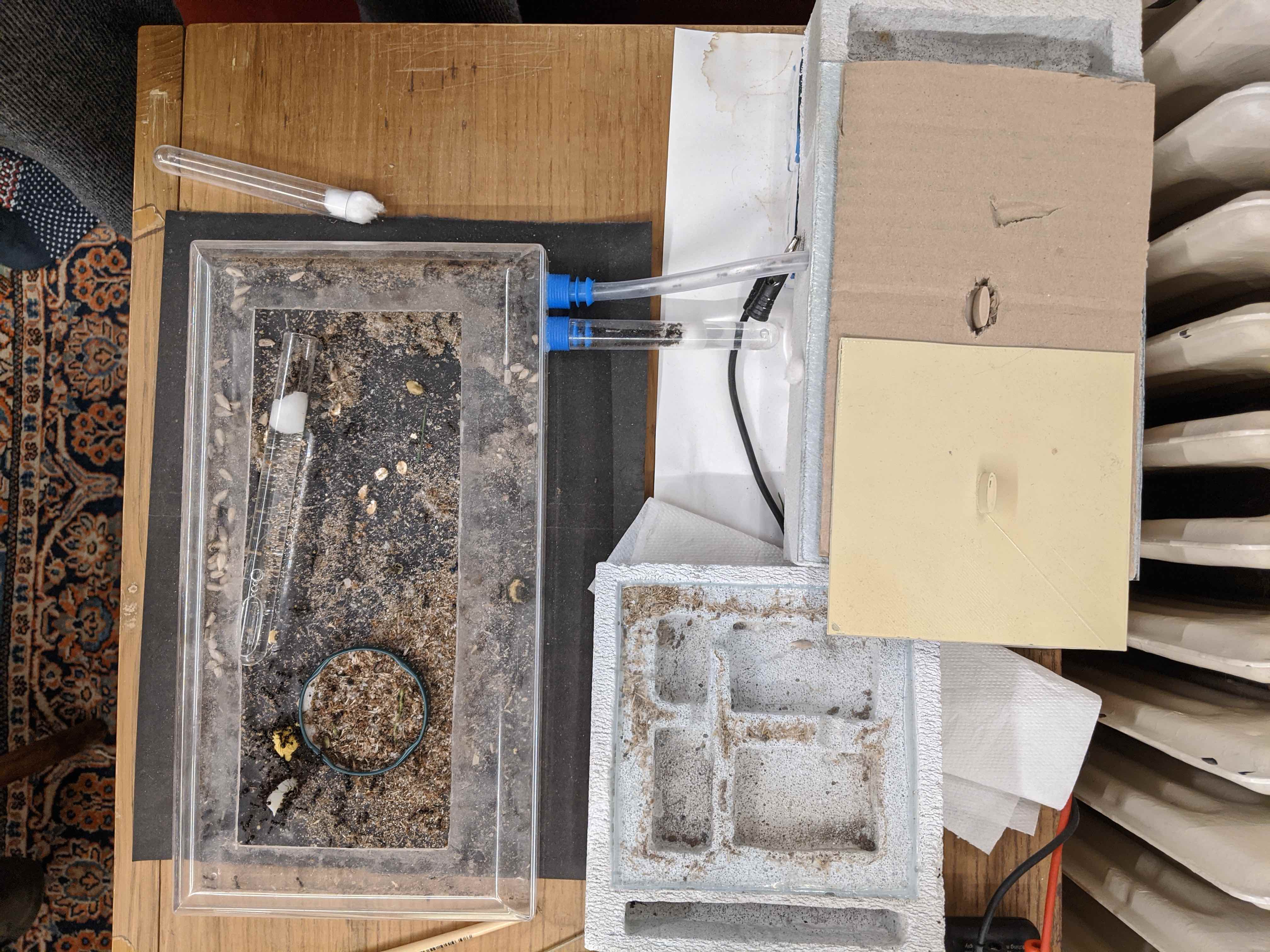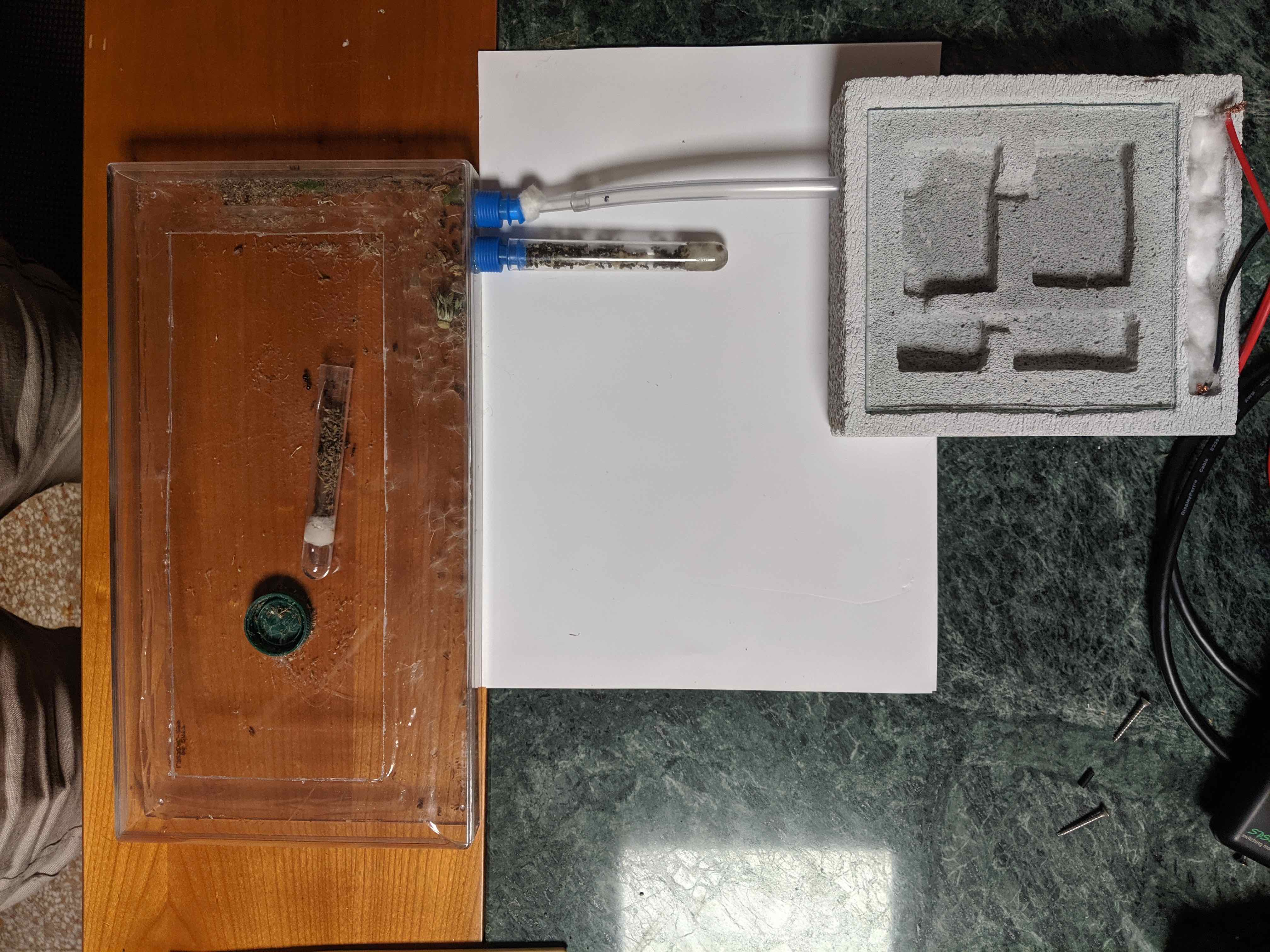 Allego anche una foto del setup corrente. Il nido ha quella scanalatura dove fornisco acqua, mentre il filo nero ha un suo corrispettivo rosso dall'altra parte del nido: un buco attraversa il nido al di sotto delle camere abitate e ha dentro delle resistenze, che accese riscaldano una parte del nido. Normalmente sul nido ho un "coperchio" fatto con la stampante 3D per tenerle al buio, in questo momento ci ho messo sopra anche un pezzo di cartone in modo che quando sono in battuta diretta di sole non si scaldino troppo. Vicino il vecchio nido, che presto verrà collegato.