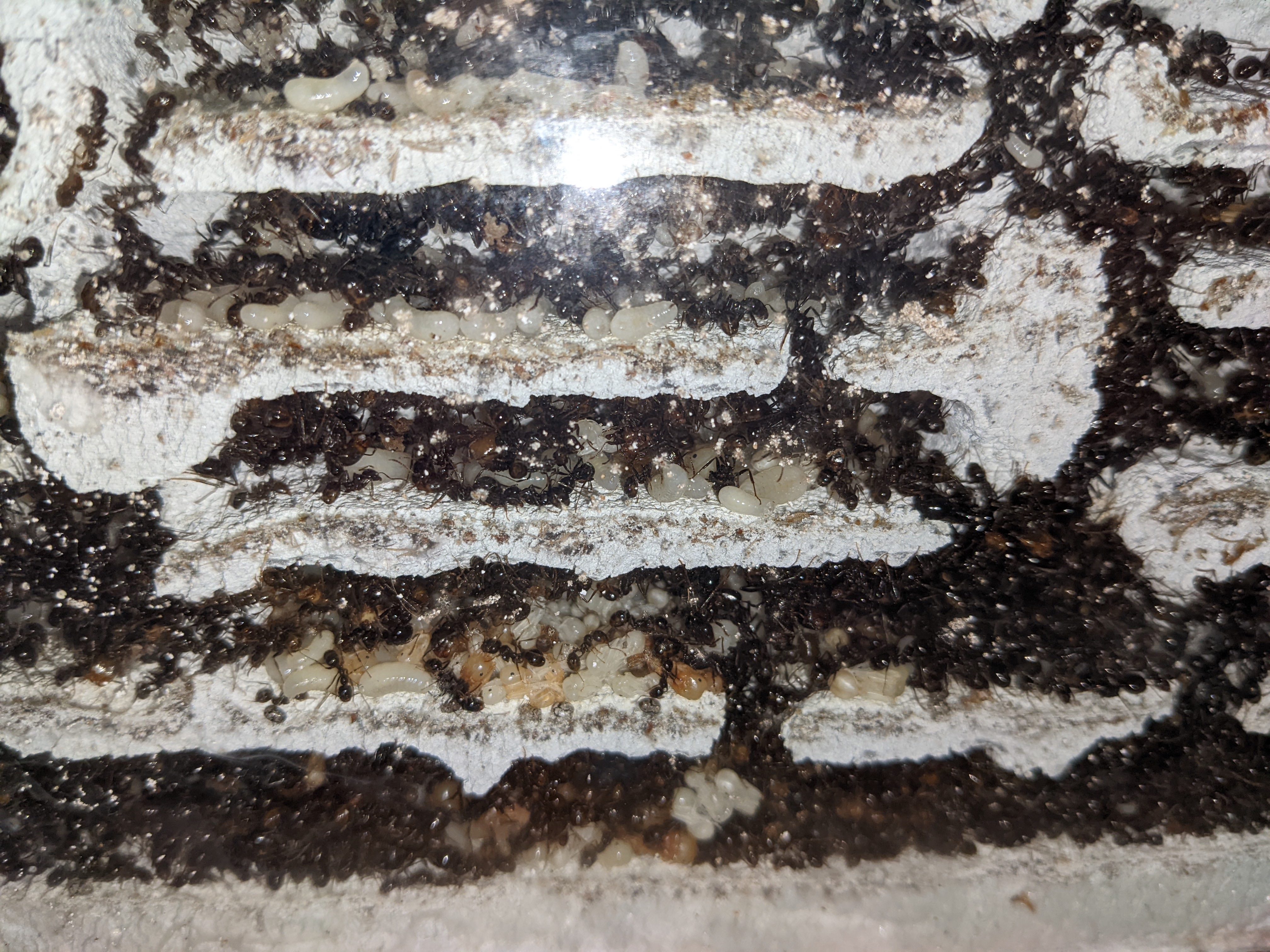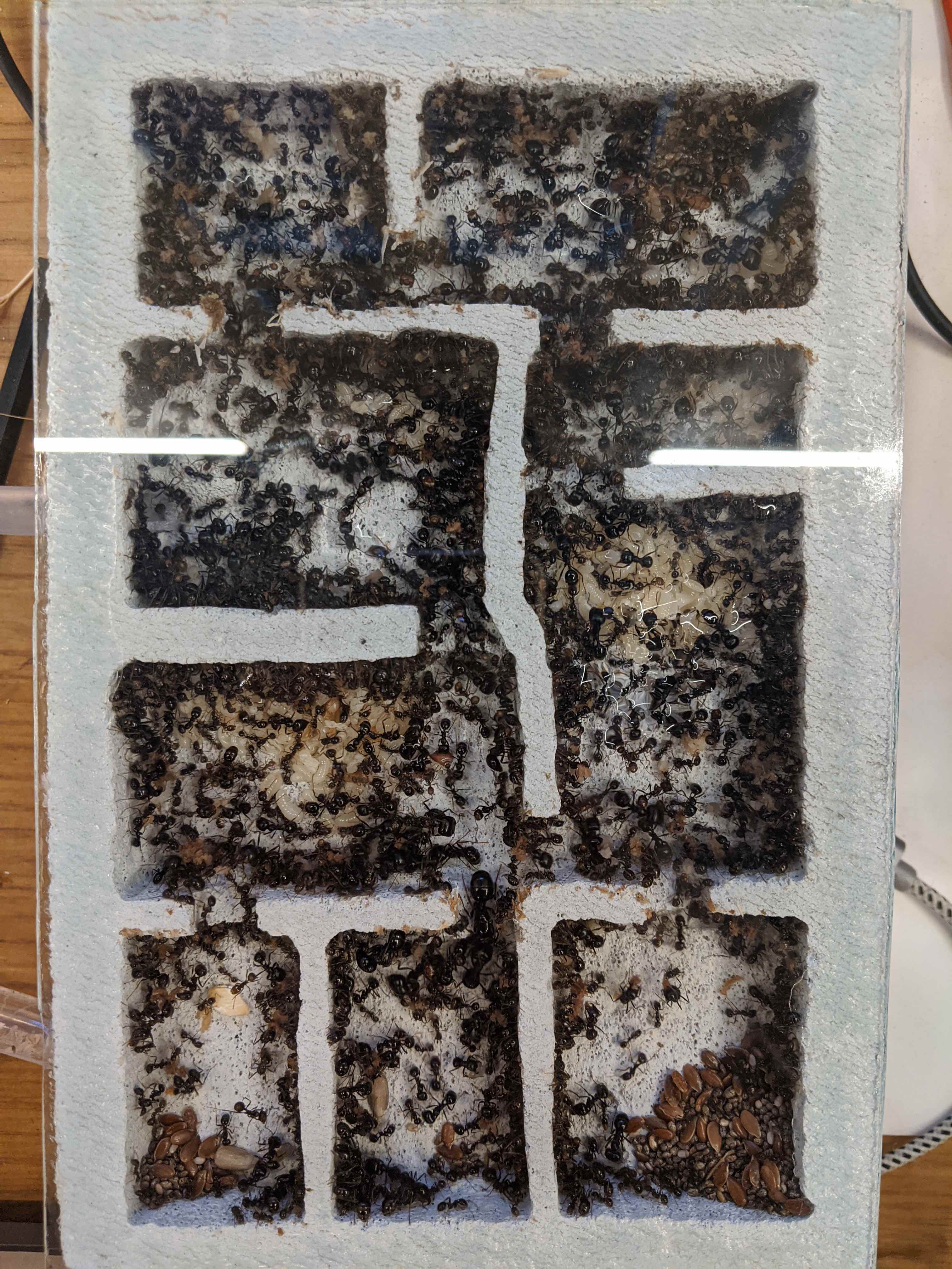 Tra università e impegni vari sono stato davvero poco a casa e quindi non ho molte foto da mostrarvi. Ora però la covata è aumentata sensibilmente e stanno sfarfallando le prime operaie ancora non del tutto pigmentate. Purtroppo le stanze non garantiscono ottima visibilità (soprattutto quelle più basse nella zona bassa del nido) e non sono sicuro se ci sia un sacco di altra covata nascosta sul fondo. Le formiche sono tornate voracissime e mangiano di tutto. Ho problemi a trovare insetti freschi ma apprezzano anche prosciutto e uova. Hanno allungato le zampe anche su qualche pezzo di frutta.