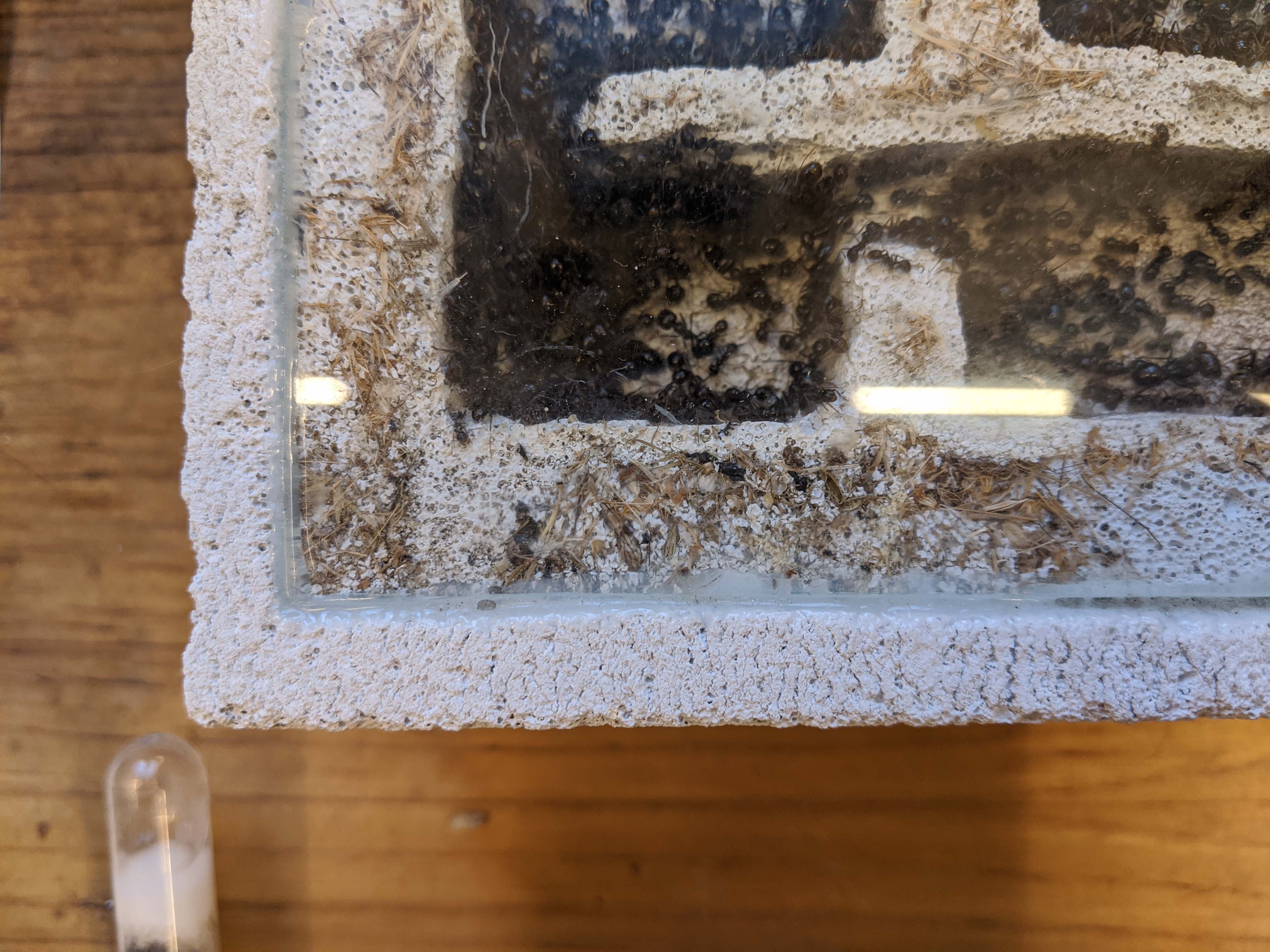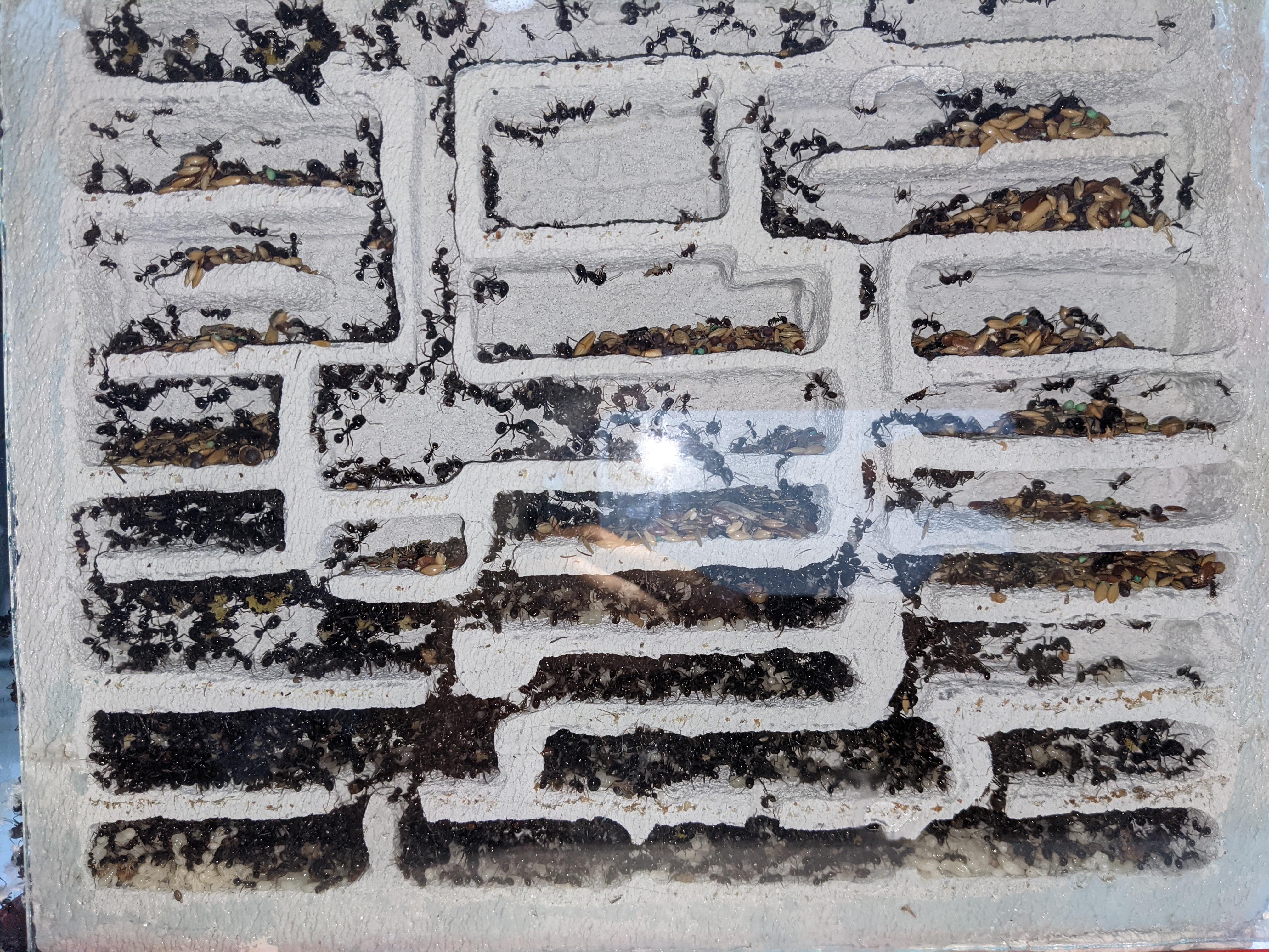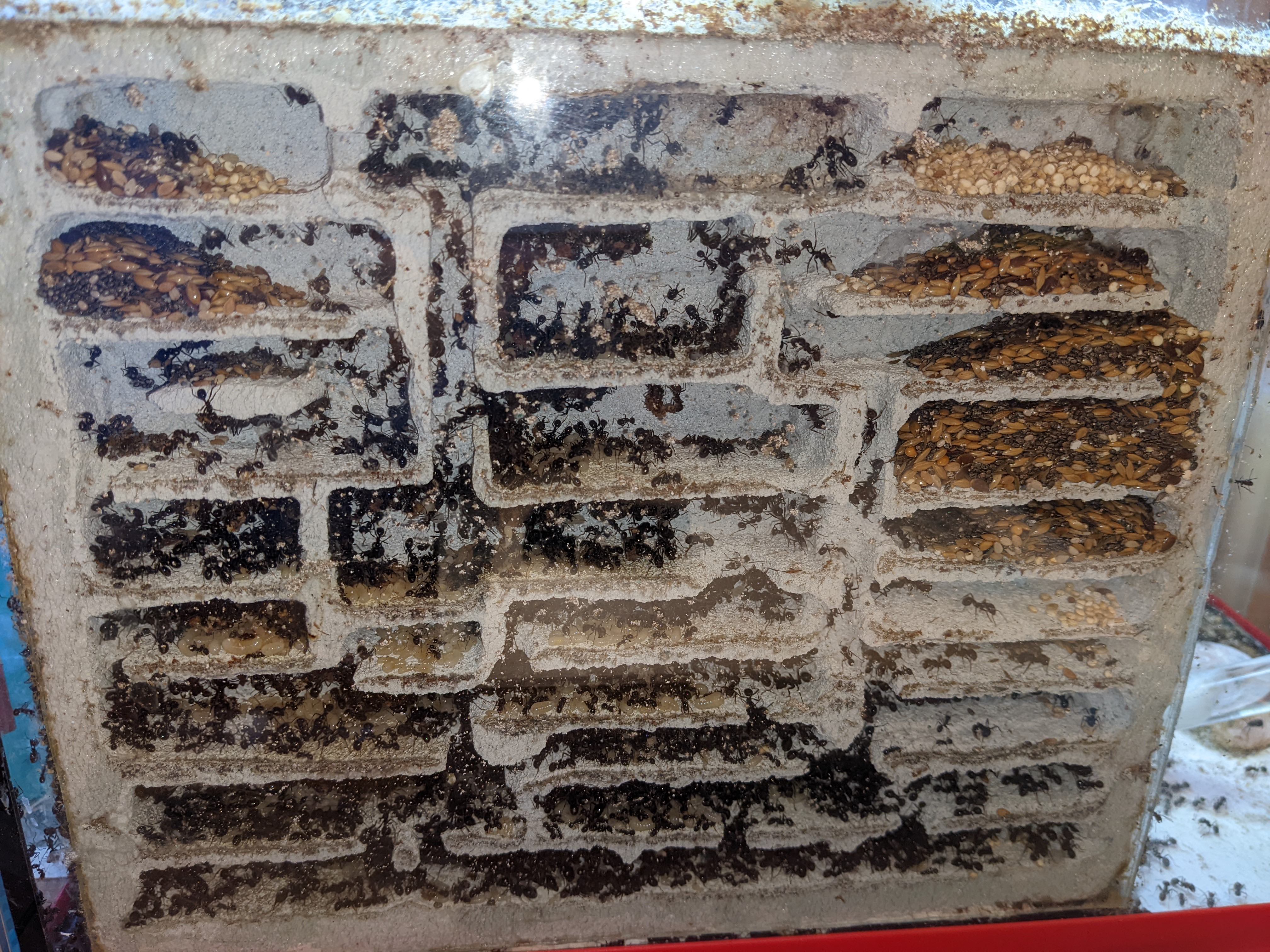 Comunque, all'inizio il nido era molto idratato e con mia grande meraviglia hanno cominciato a scavare (non avevano mai limato nemmeno uno spigolo in 2 anni!). Dopo un po' si sono fermate e sembrano aver usato i proventi dello scavo per tappare l'intercapedine tra vetro e parete. Ho poi smesso di idratare per paura di evasioni e appena il nido si è seccato ci hanno appunto messo molti semi. Ora purtroppo da me è tornato il freddo polare e la stanza è scesa ai 14 gradi, spero torni il caldo così anche loro ripartono.