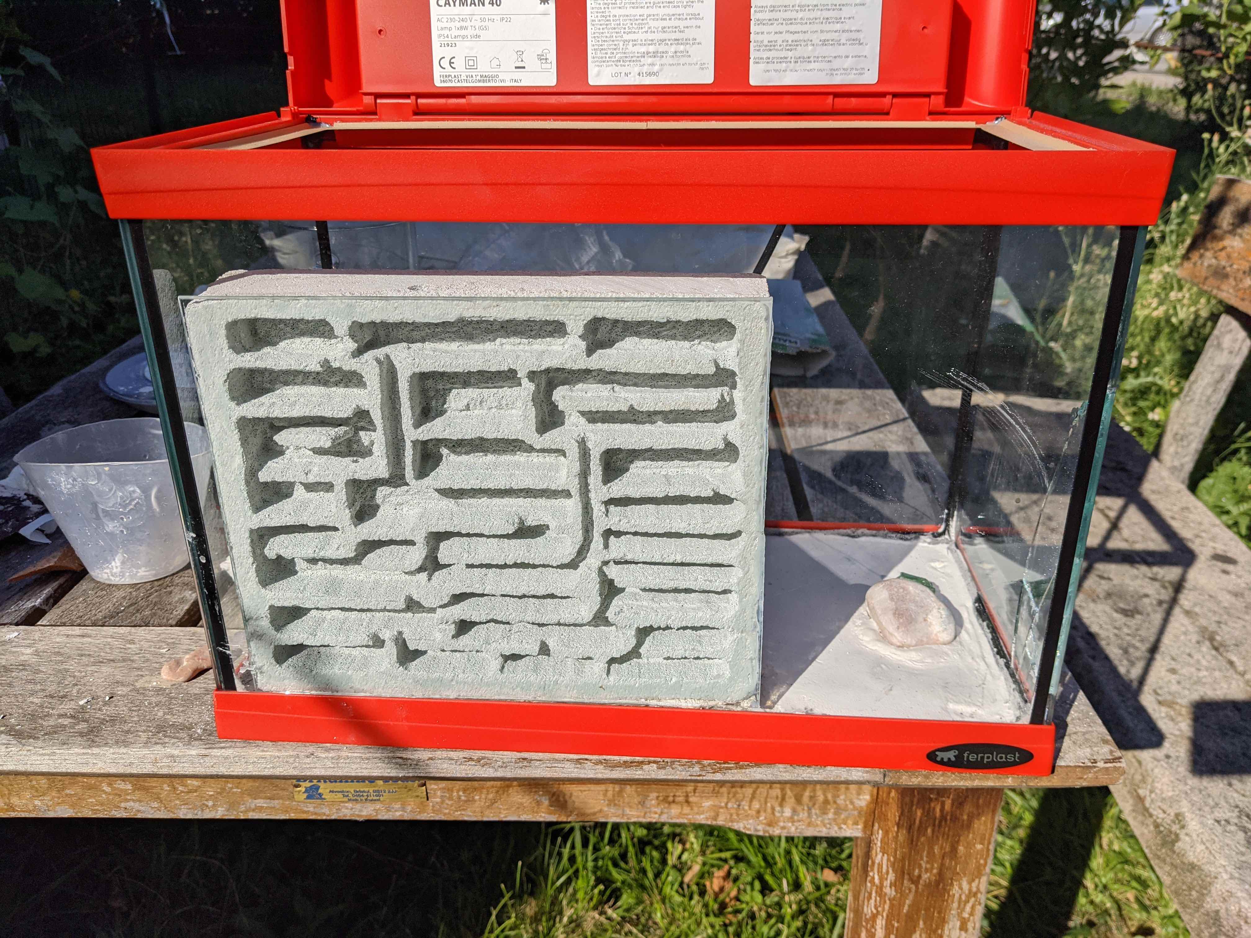 Mi ero trovato molto bene col gasbeton e così ho optato per mantenermi su quel materiale. Per scongiurare in qualsiasi modo ogni tentativo di fuga, ho optato per il posizionamento del nido in una teca. Fortuna vuole che il negozio di animali del paese aveva un acquario rotto in un angolo: non poteva certo tenere acqua e avrebbe dovuto buttarlo, ma per le mie formiche andava più che bene e così sono tornato a casa col mio premio gratuito.