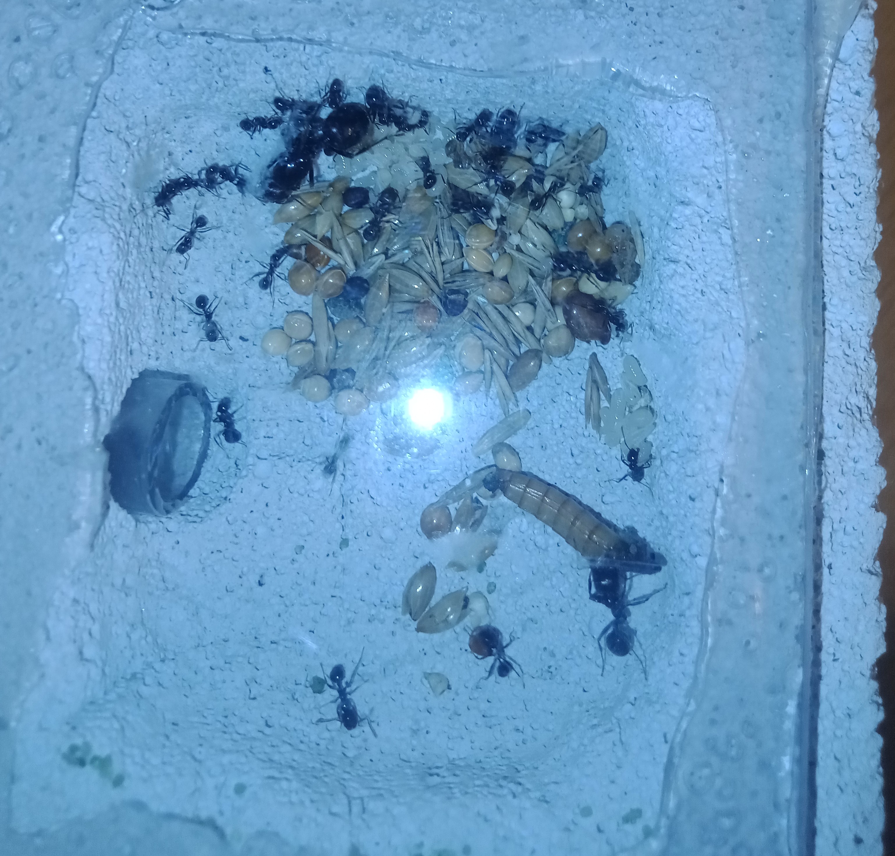Un mese fa mi é arrivata una colonia di Messor barbarus che contava circa 30. ho subito aperto la provetta in arena fornendogli dei semi spezzati, la colonia presentava già 3/4 larve che si stavano trasformando in pupe e una decina di uova.per fortuna loro sono andato in vacanza due settimane lasciandole tranquille. oggi tornato a casa dandogli una rapida occhiata ho notato che tutte le pupe si erano schiuse e la regina aveva deposto altre uova e ho potuto notare la presenza della prima media delle colonia ancora in fase di pigmentazione.