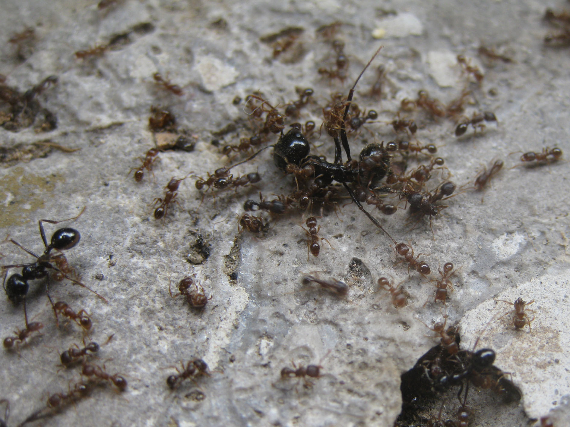 Durante l’estate ho lasciato libera circolazione alla colonia: le esploratrici passeggiano tranquillamente sul davanzale della finestra, e non sembrano minimamente interessate ad introdursi in casa; in compenso ci sono stati alcuni scontri armati con la popolazione di Lasius emarginatus, che un pomeriggio hanno attaccato direttamente il tubo di accesso, cosa che ha costretto le Messor a barricarsi, dopo aver riportato alcune perdite. L’incapacità militare delle mietitrici di fronte alle minuscole e rapide Lasius è disarmante: solo il fatto che la popolazione abbia ormai superato le 500 unità mi ha lasciato tranquillo sul fatto che il nido non potesse essere veramente in pericolo.