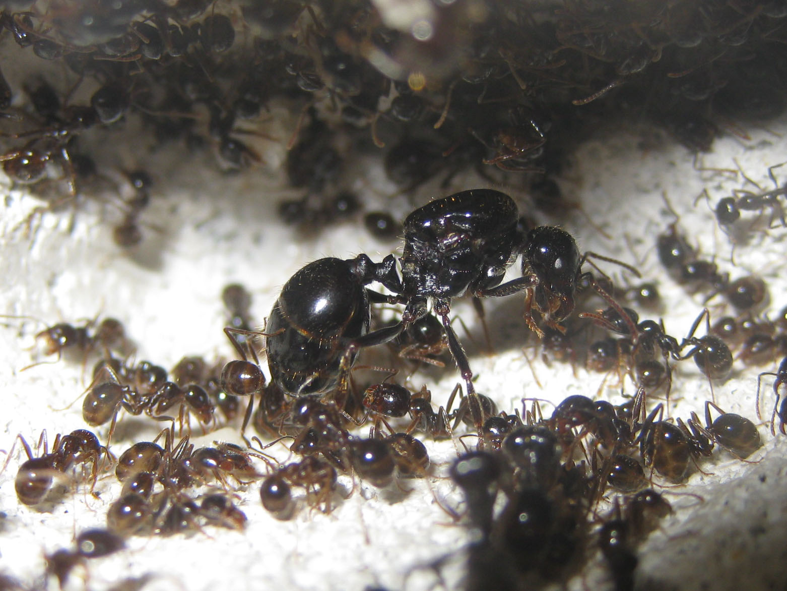 Ci ho messo quasi due giorni a trasferire tutta la popolazione nella nuova sede, per stressare e ferire meno operaie possibile. Ho tirato un sospiro di sollievo quando ho trovato la regina in ottime condizioni. Appena messa nel terreno libero, è stata trascinata al sicuro nel nido di gesso, seguita poi da larve e provviste (qualche centinaio le larvette al primo stadio).