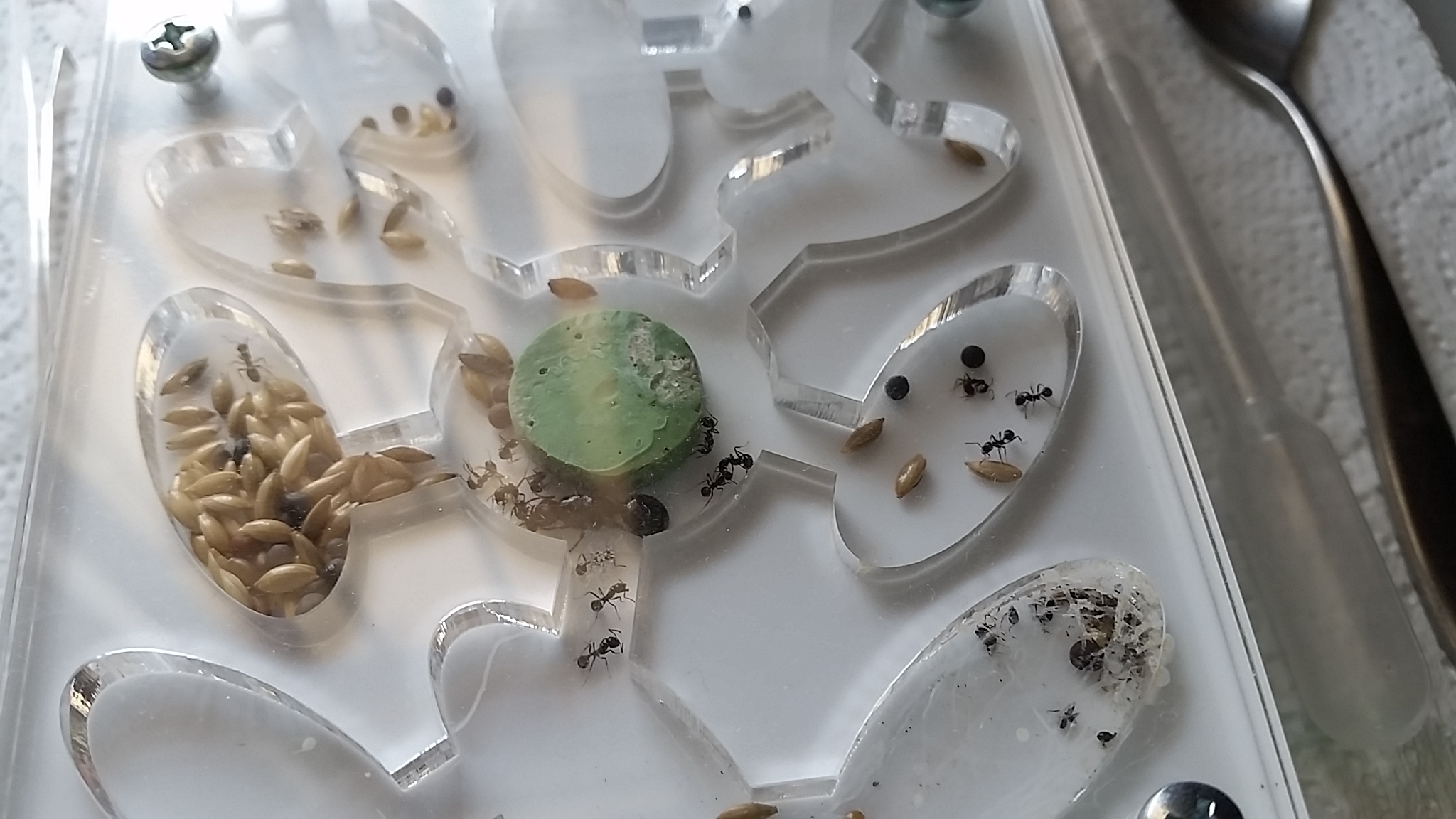 Allora...che rebus! Io ho dato loro i semi fornitemi dal venditore, il quale mi ha dato anche il formicaio, poi, ho dato loro il misto semi che do sempre al mio canarino.Dalla foto non si vede ma dentro la formicaio hanno semi di tutte le dimensioni, che non mangiano.Le dimensioni del formicaio sono ridotte, 10x20x10 cm.Quando mi sono arrivate erano in 19-21, quindi credo giuste per questo formicaio.Per un pò di giorni tutto era andato bene, le nuove operaie nascevano, ed erano diventate 22-24 successivamente, ho notato che le operaie diminuivano, e le uova...sparivano, poi, dopo il pezzettino di crocchetta (un caso, forse) la moria che continua anche ora.Ora ho cambiato l'acqua alla vaschetta che dispensa l'umidità, ho messo semi di tutti i tipi nell'arena, vado a procurarmi un lombrico e gliene do un micropezzo, vediamo se non mangiano ancora...