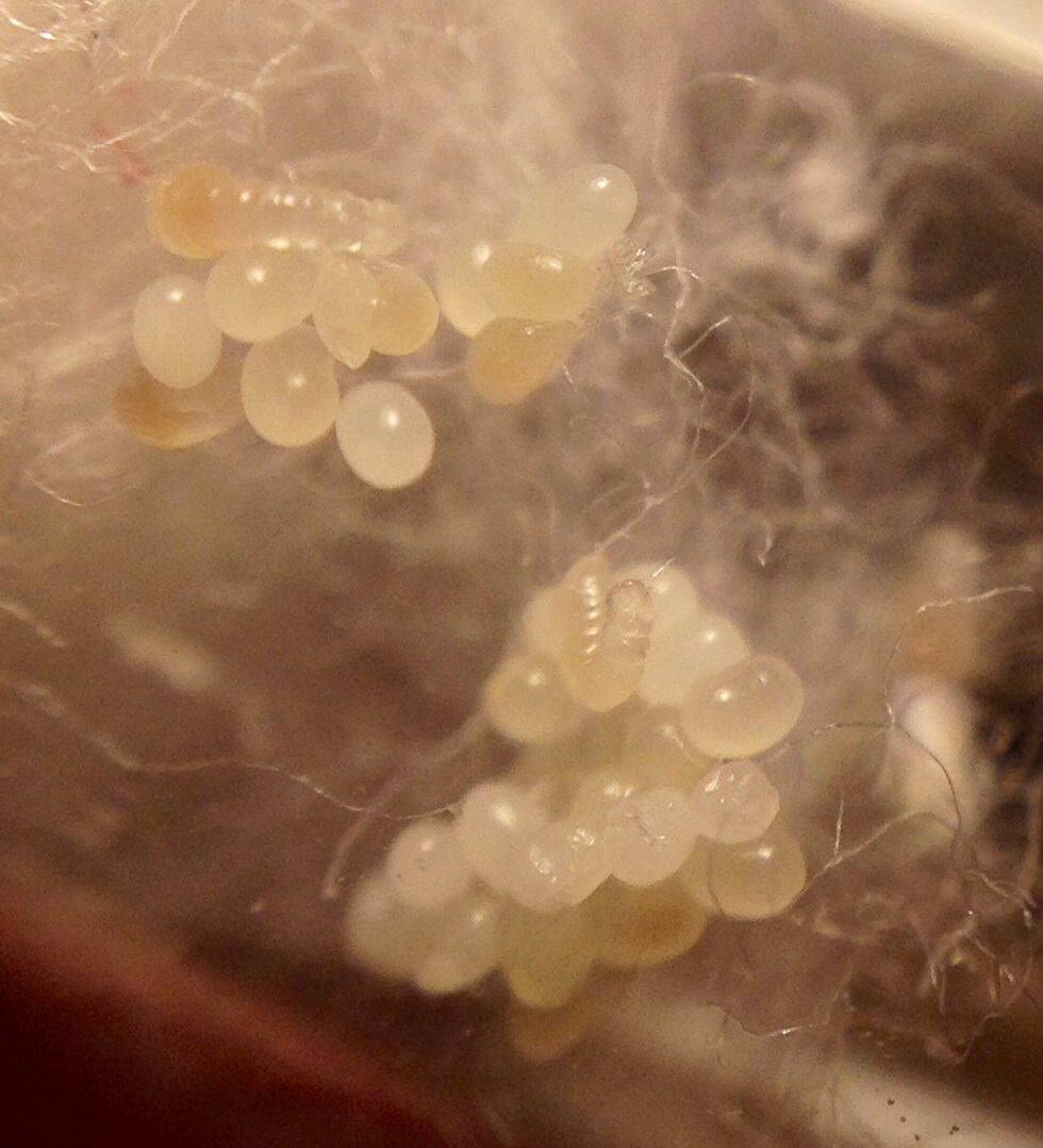 Il 19/06 una delle due regine che sono arrivate con le uova ha visto la nascita delle prime 4 larvette, queste si presentano molto allungate con una "bocca" molto lunga e mobile.