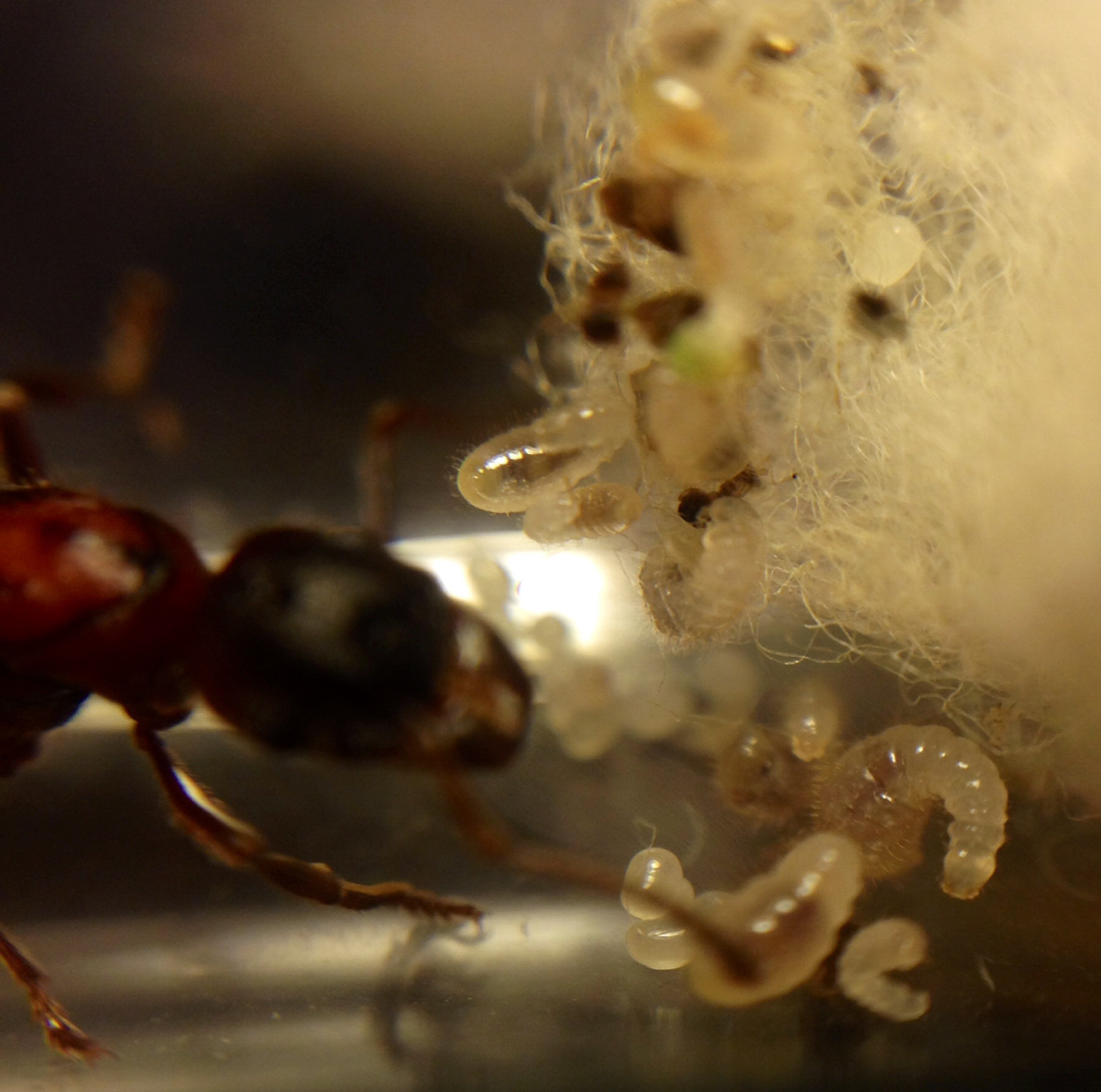 La regina A conta circa 12\15 larve, contanto quelle più grandi e quelle appena nate, le uova invece si sono ridotte enormemente e contano meno di 10 unità, segno che vengano usate per alimentare le larve. questa regina consuma principalmente proteine.