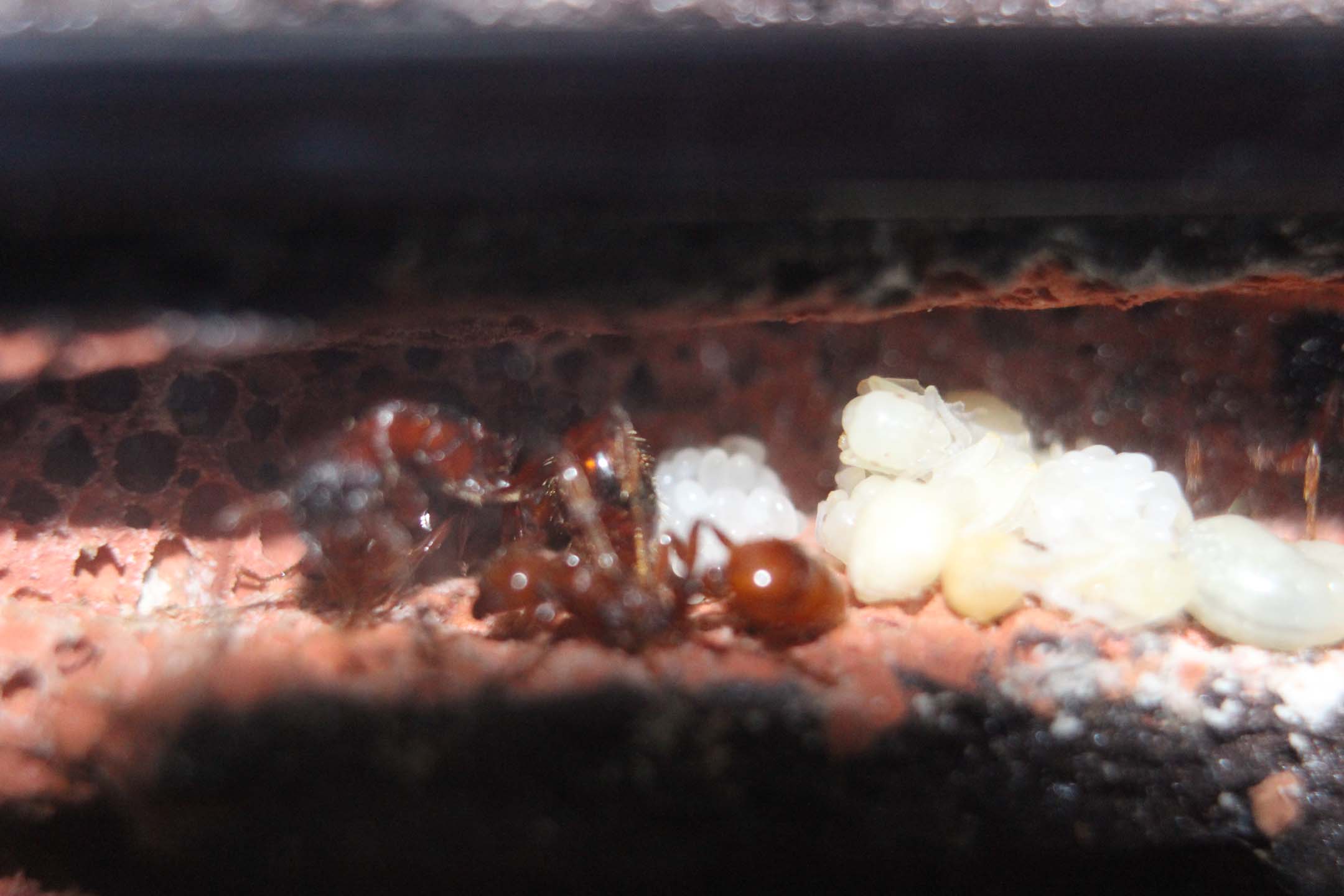 Ancora oggi mi snobba il miele ed è difficilissimo vedere operaie in giro per l'arena. Le alimento con microgrilli e zanzare, che lascio scivolare dentro il buco di accesso al formicaio (loro hanno colonizzato la prima stanza dopo l'entrata).