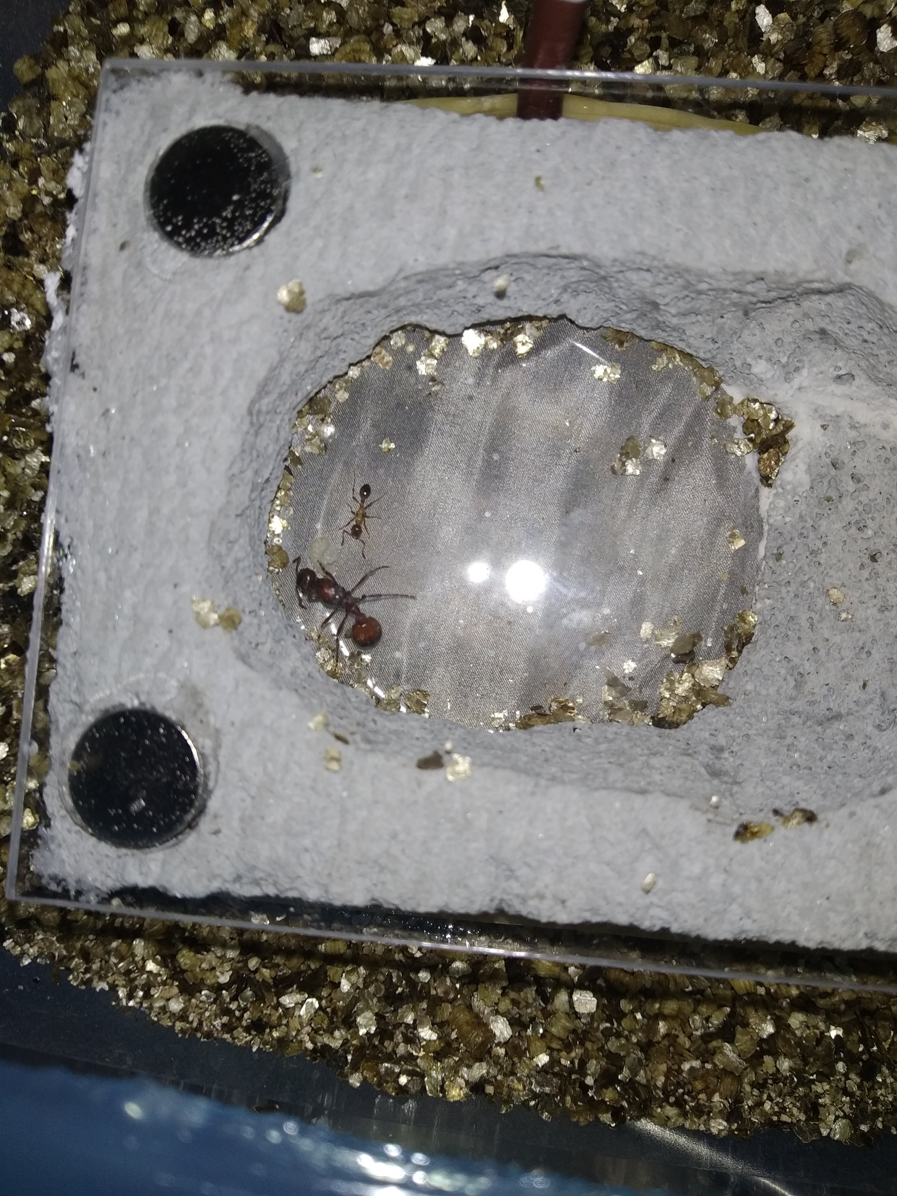 Trasferisco la regina Gamma dentro un formicaio con water tower e arena con substrato di vermiculite, la regina ha diverse uova, due larve e una pupa in fase di pigmentazione.