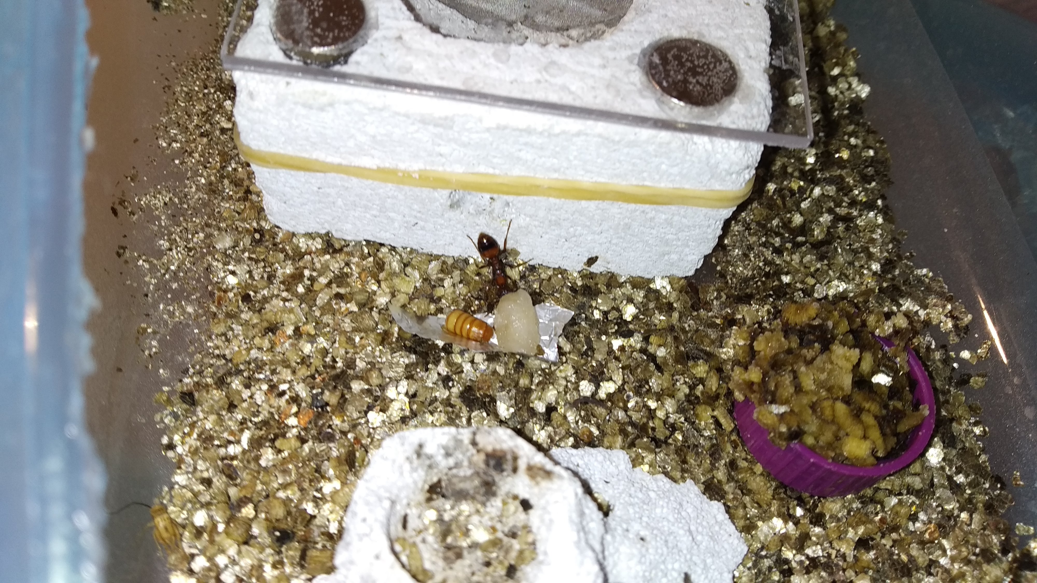 La colonia Gamma si presenta con un’operaia, una pupa, un paio di larve e alcune uova, ho potuto notare che fin dai primi giorni la nanitica era piuttosto intraprendente, a differenza di altre specie, e gira in arena per foraggiare.