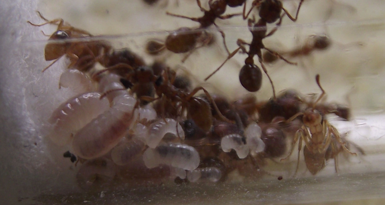 La scorsa notte mi sono svegliato e ho approfittato del buio per vedere il comportamento del mio scorpione, e guardando l'arena delle Myrmica, per la prima volta, l'ho vista vuota, deduco che siano formiche diurne, sempre in arena ci sono 4-5 operaie, ma la notte l'arena era vuota. Le 5 regine depongono e le altre pupe sono sfarfallate, riesco più o meno a contare 37 operaie più le 5 regine. Quando fornisco cibo proteico (ora per esempio una pupa di camola) le operaie in arena arrivano a essere una decina.