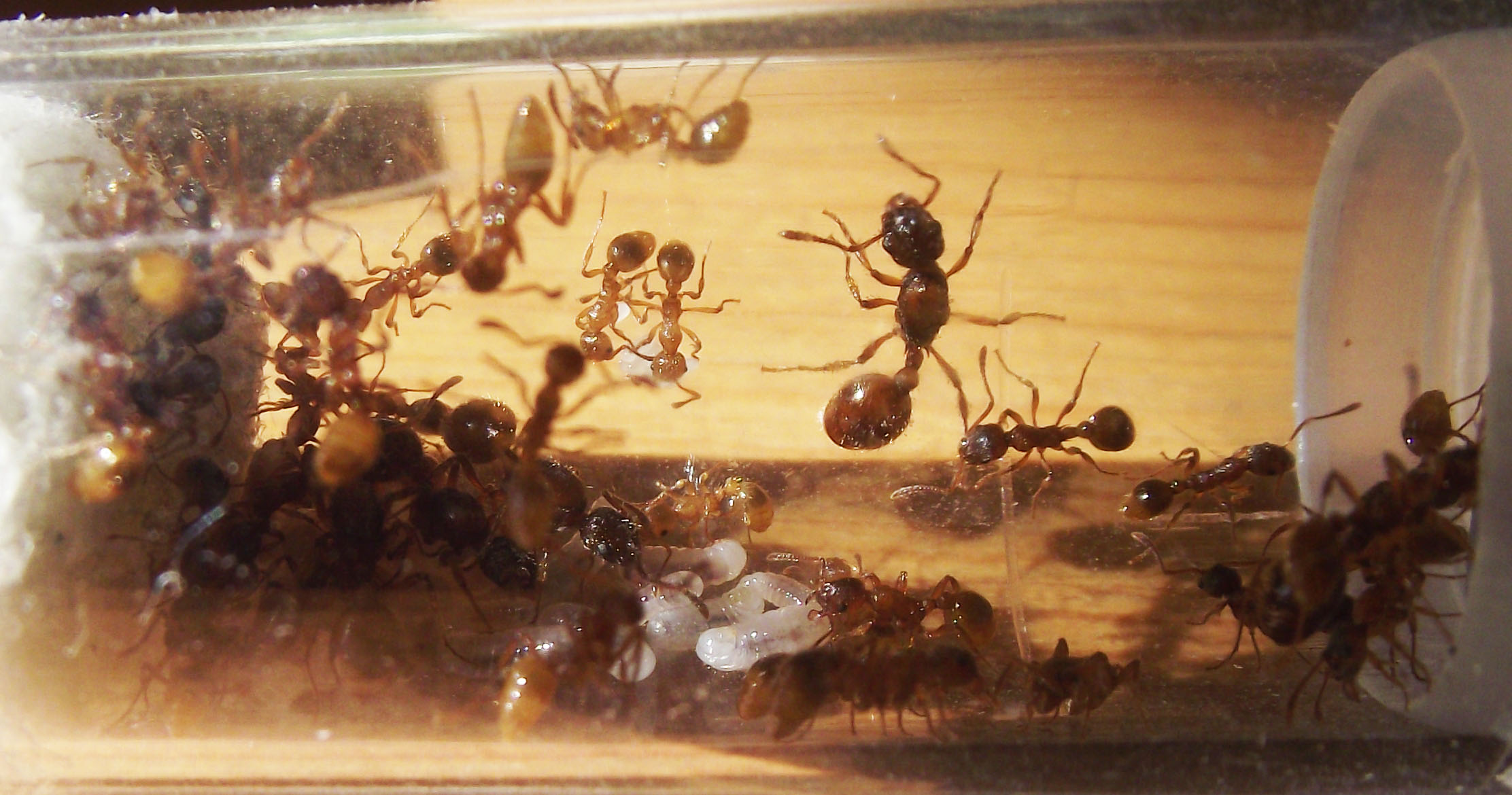 Nella notte quindi ho messo una normale provetta con serbatoio, oggi le ho trovateli dentro, regine, covata e operaie, ho chiuso la provetta col tappo e collegata con un tubo all'arena, adesso le ho potute contare meglio, sono più di 30 operaie, qualche pupa e una decina di larve, non sono sicuro di aver trovato uova.