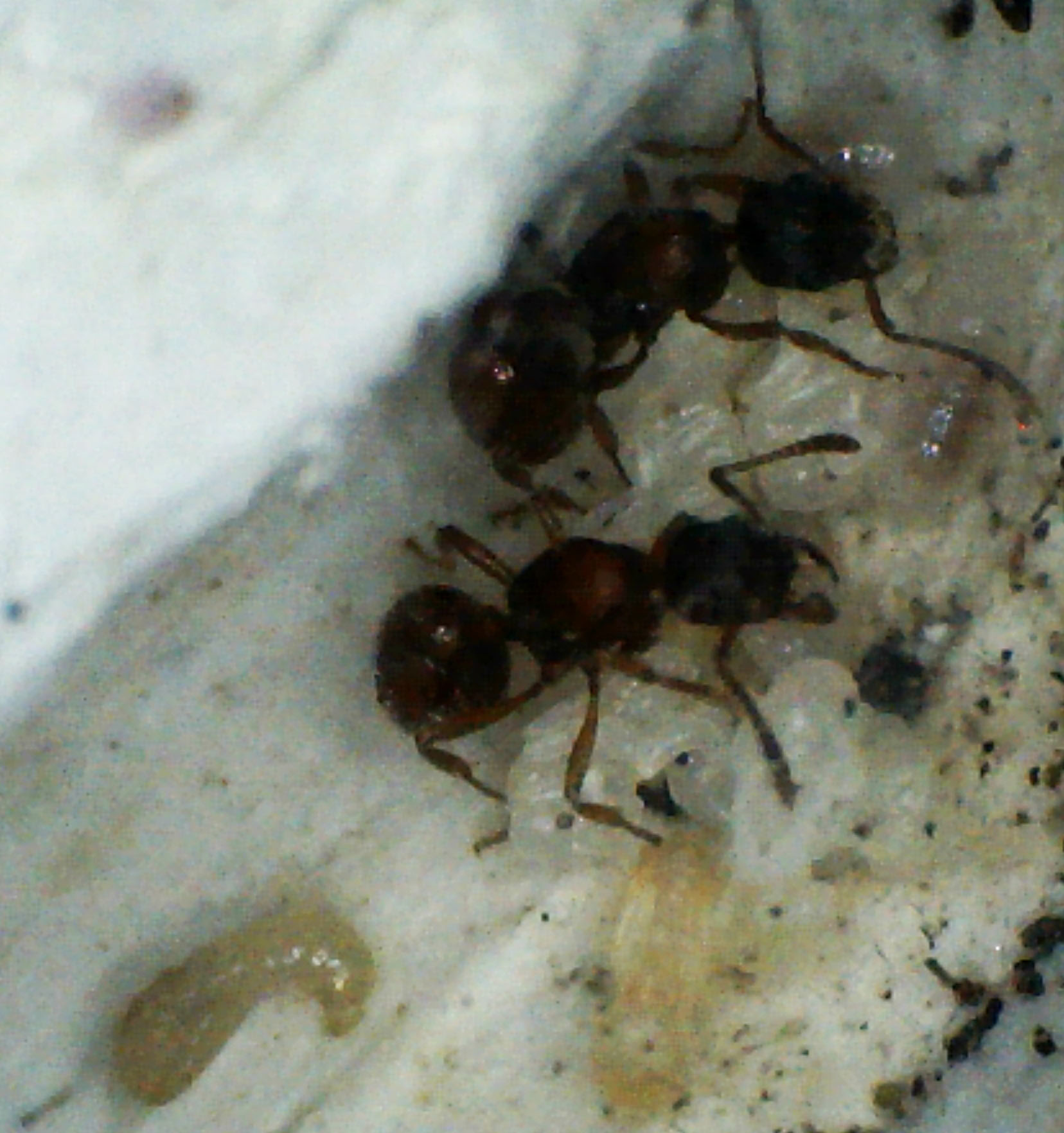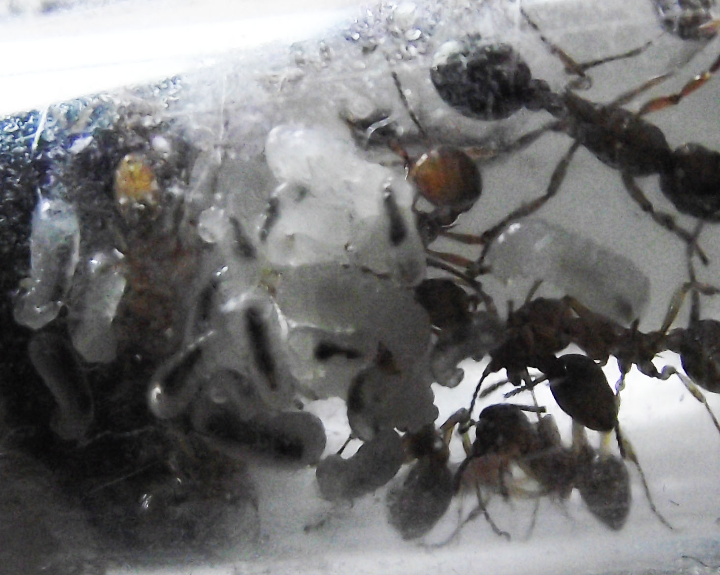La piccola colonia cresce ma molto lentamente ed è molto poco attiva, qualche uovo una quindicina di larve e due pupe, le operaie sono una sedici ma non curano molto la pulizia della provetta ed è cosi sporca che è difficile contarle bene. Non essendo cosi attive non ho avuto ancora la necessità di aprire la provetta in una arena. Ma prevedo con la nascita delle prossime larve che si raddoppi il numero della colonia. Con la loro inattività noto anche un consumo minore di cibo.