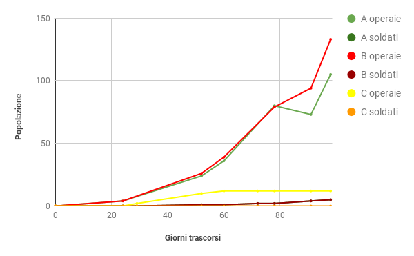 Se andiamo ad addizionare i morti nell'antifuga alla popolazione attuale delle colonie... si ottiene un andamento molto più carino! 35 vittime assegnate ad A e 25 a B. Si nota che comunque la popolazione di B sta aumentando più rapidamente. Effetto delle proteine?