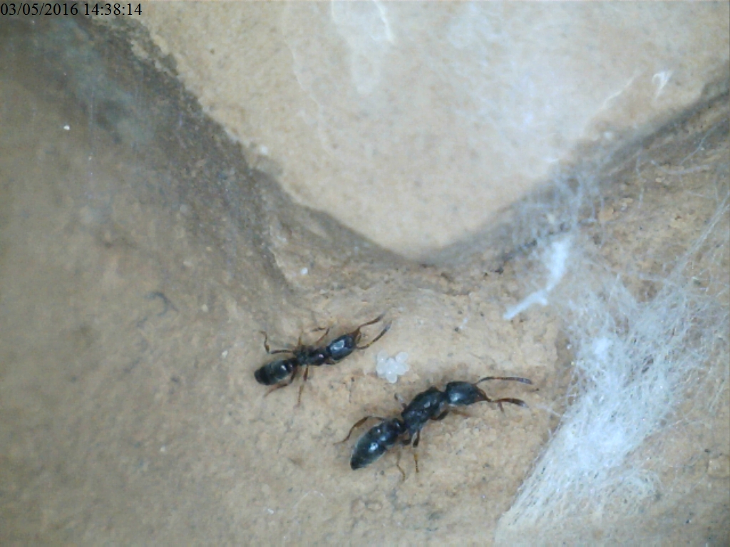 Sono traslocate in camera mia, assieme alle uova. Non so dire se questo sia negativo o positivo: è probabile che le due regine muoiano, ma se fondano mi ritroverò, fra qualche anno, invaso dalle Ponerinae! Comunque... La colonia Alpha ha cambiato nido ed è stata alloggiata in un nido in gesso, simile al nido in cui era precedentemente, tranne per il colore (allora, ero stato poco furbo, perché con il colore freddo del gesso non si vedeva bene la covata (risultato: foto schifose): adesso, il formicaio è colore terra e posso fare foto decenti e posso controllar meglio la situazione); la colonia Beta, invece, sembra aver la prima covata e la regina ha un addome molto dilatato.